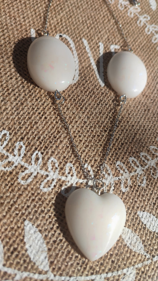 sautoir cœur et ovale blanc holographique en résine epoxy