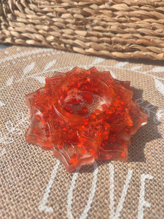 bougeoir fleur de lotus transparent avec feuille rouge résine epoxy