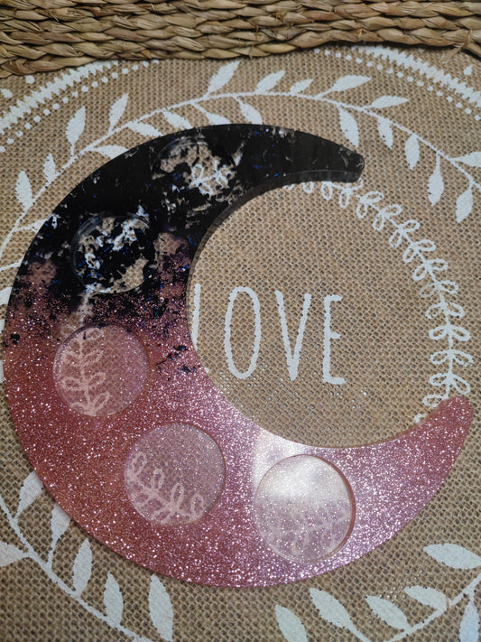 bougeoir lune rose pailleté et feuille noir résine epoxy