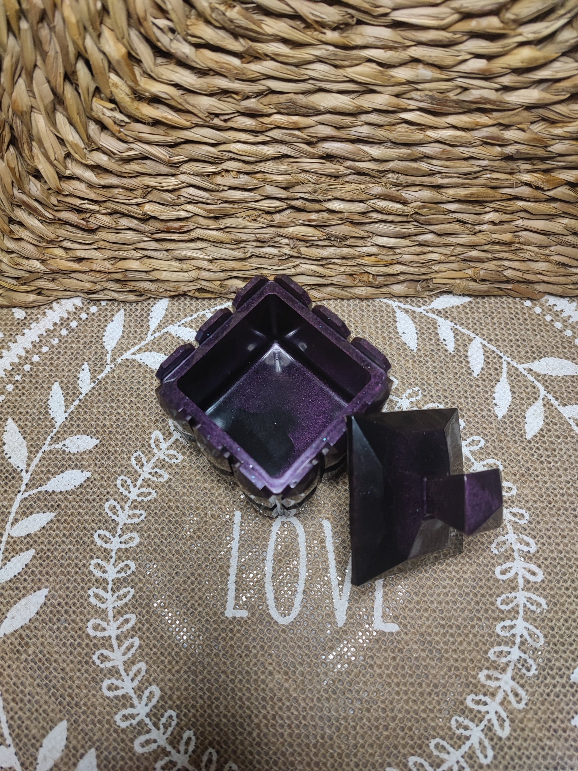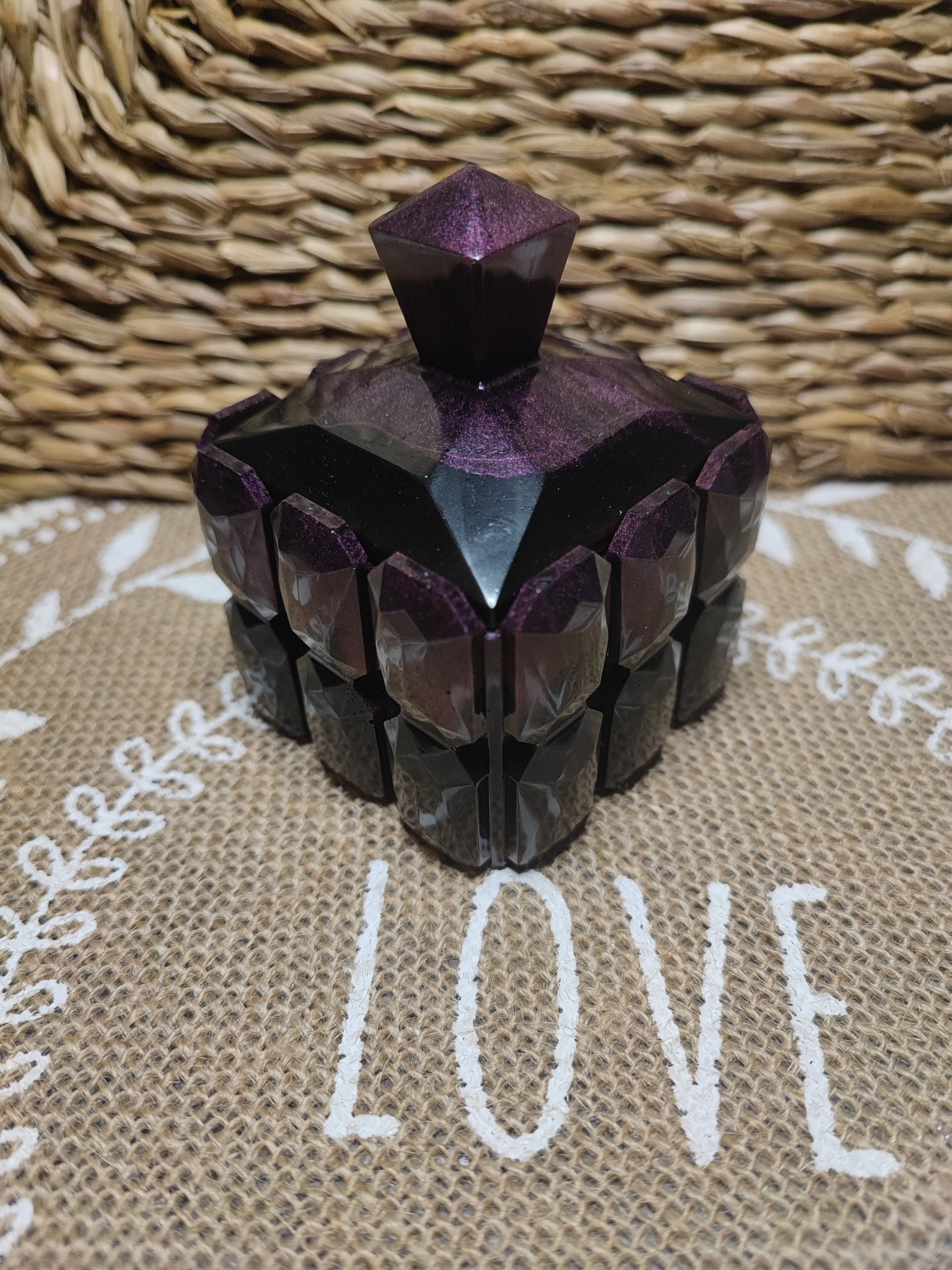 Les boîtes à bijoux, en résine epoxy, disponibles sous ce format mesurent 4.3 cm de profondeur, 6.6 cm de diamètre, 8.5 cm de hauteur avec le couvercle