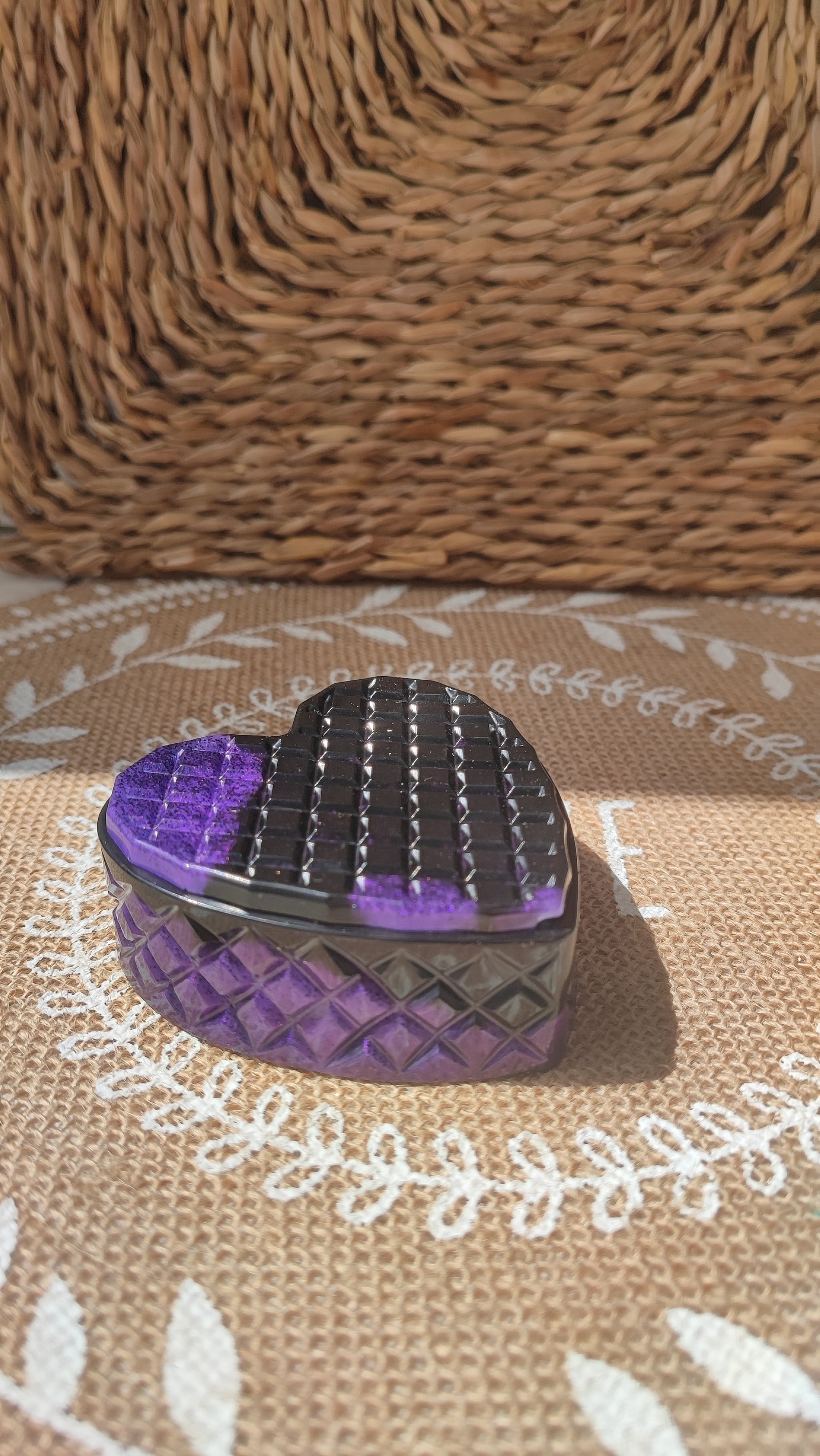 Les boîtes à bijoux, en résine epoxy, disponibles sous ce format mesurent 2.6 cm de profondeur, 7.9 cm au plus large et 3 cm de hauteur avec le couvercle.