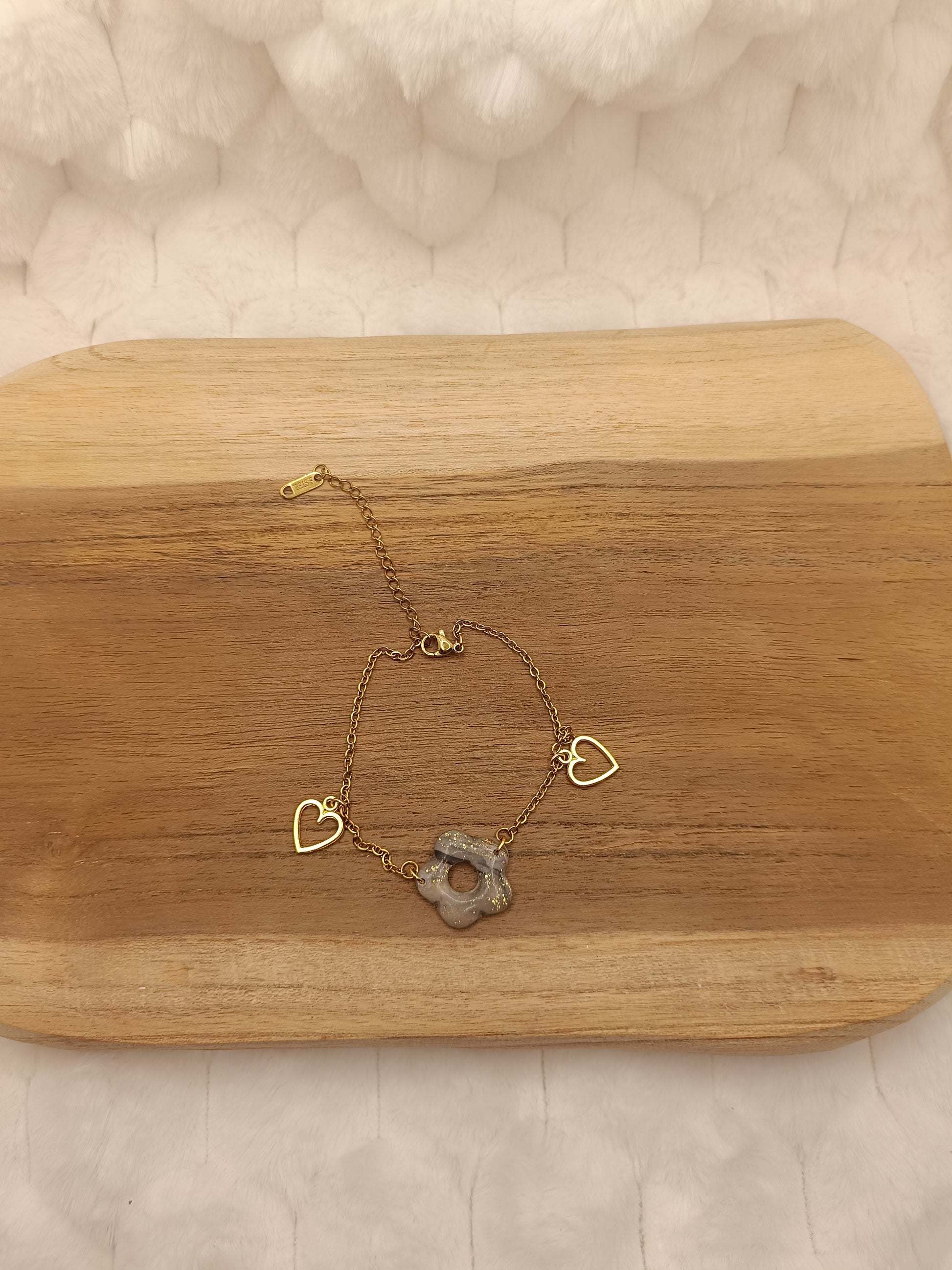 Craque pour ce bracelet doré délicat, une création artisanale pleine de douceur et d’élégance. Son design fin est sublimé par une jolie fleur en pâte polymère grise, avec un effet marbré et de subtiles touches lumineuses qui captent la lumière.