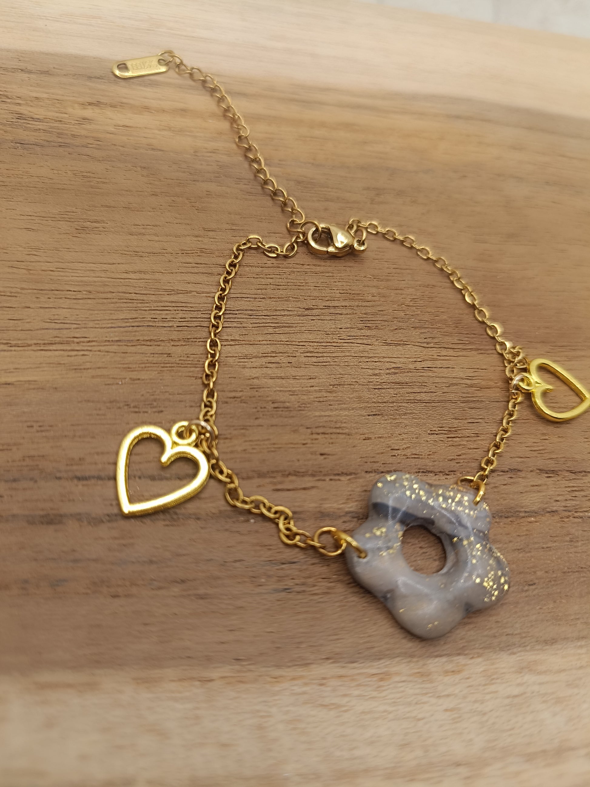 Ce bracelet est également orné de petits charms cœur dorés, pour une touche romantique et tendance. Grâce à sa chaîne fine ajustable, il s’adapte facilement à ton poignet et se porte aussi bien au quotidien que pour une occasion spéciale.
