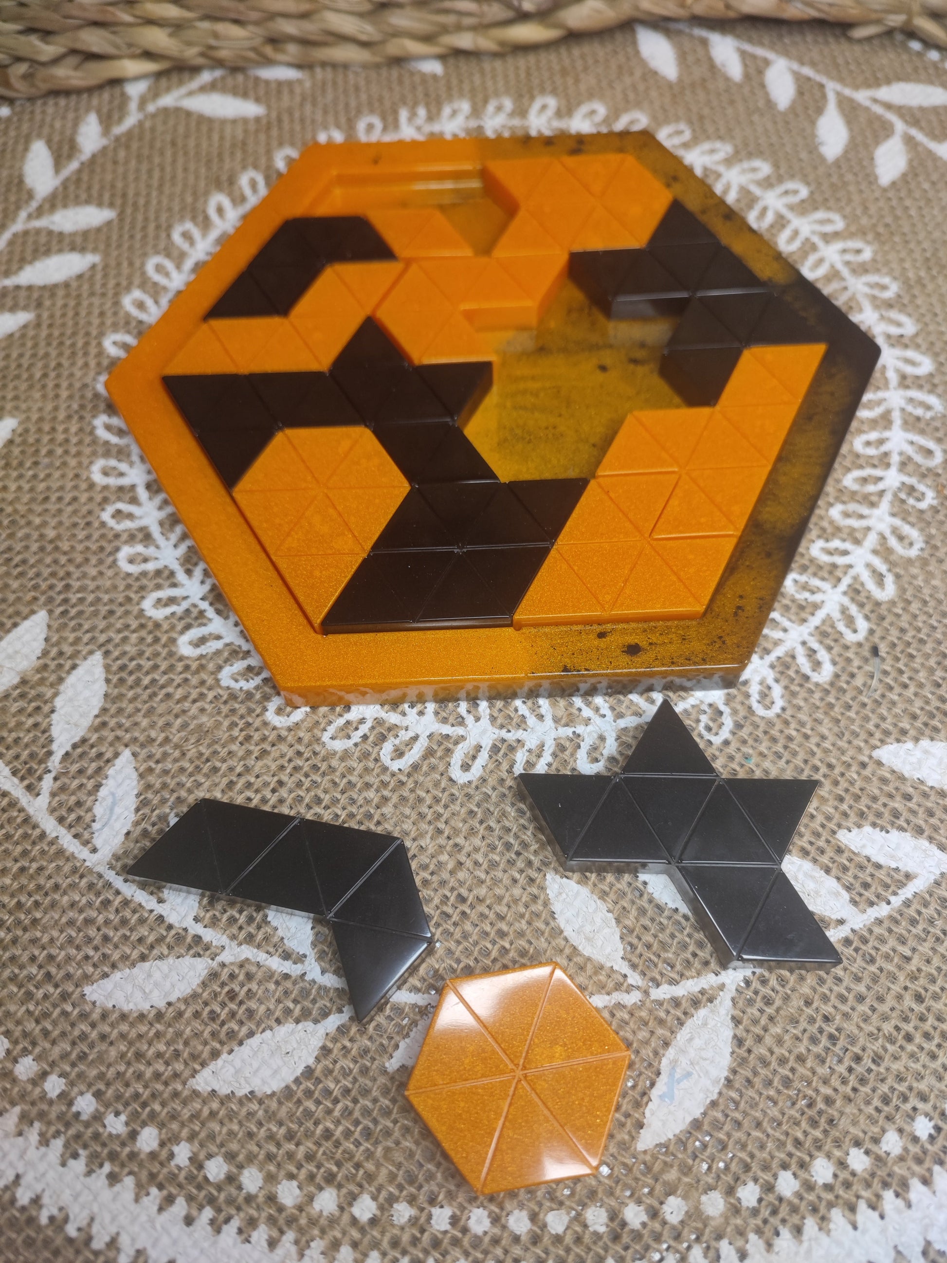 Les casse tête disponibles sous ce format mesurent 14 cm d’un côté à l’autre ( plateau hexagonal ), la surface de jeu quant à elle mesure 11 cm d’un côté à l’autre. Le jeu comprend 16 pièces au total