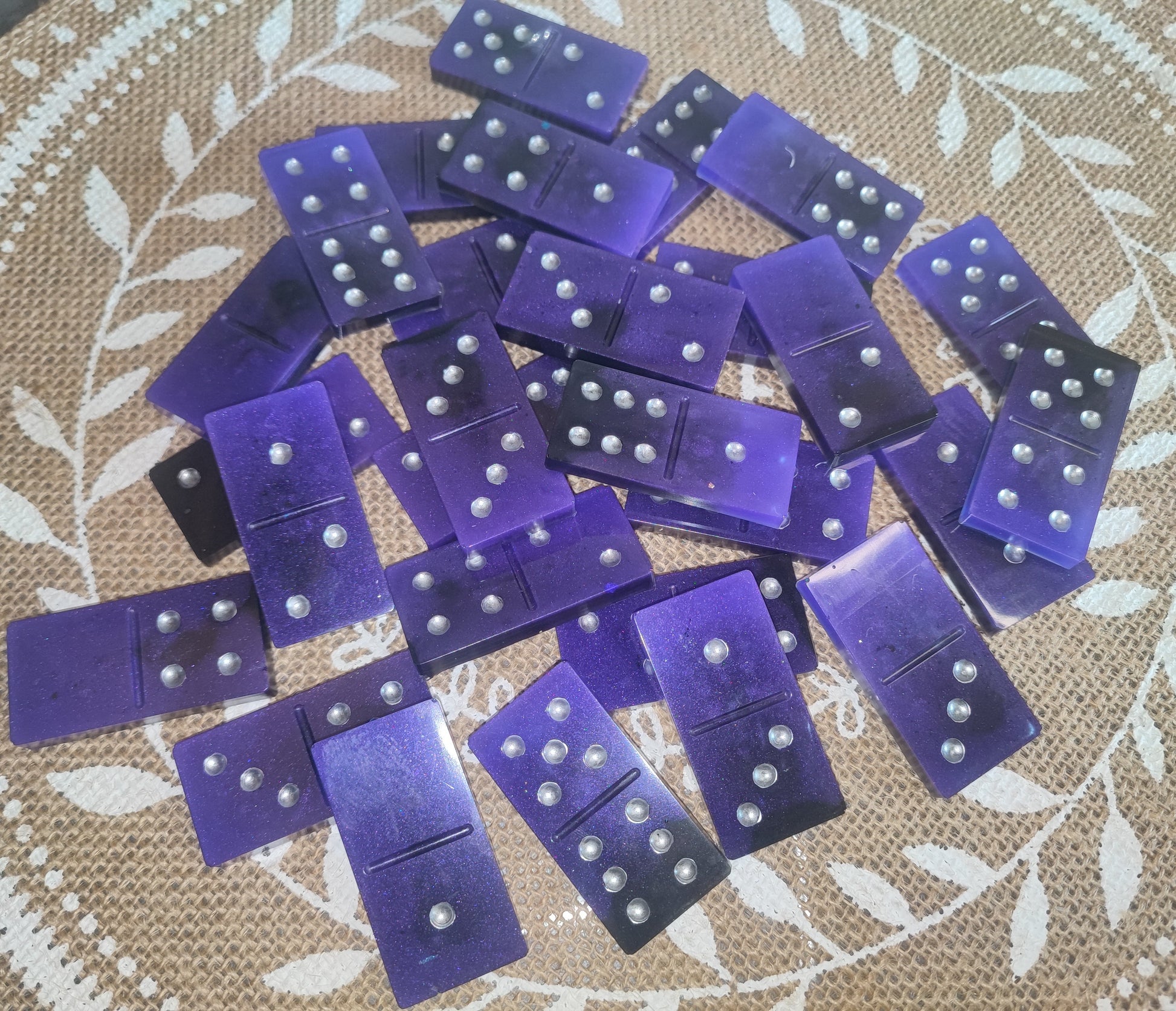 Les dominos, en résine epoxy, disponibles sous ce format sont composés de 28 pièces par jeu, ils mesurent chacun 0.5 cm d’épaisseur 2.5 cm de largeur pour 5 cm de long.