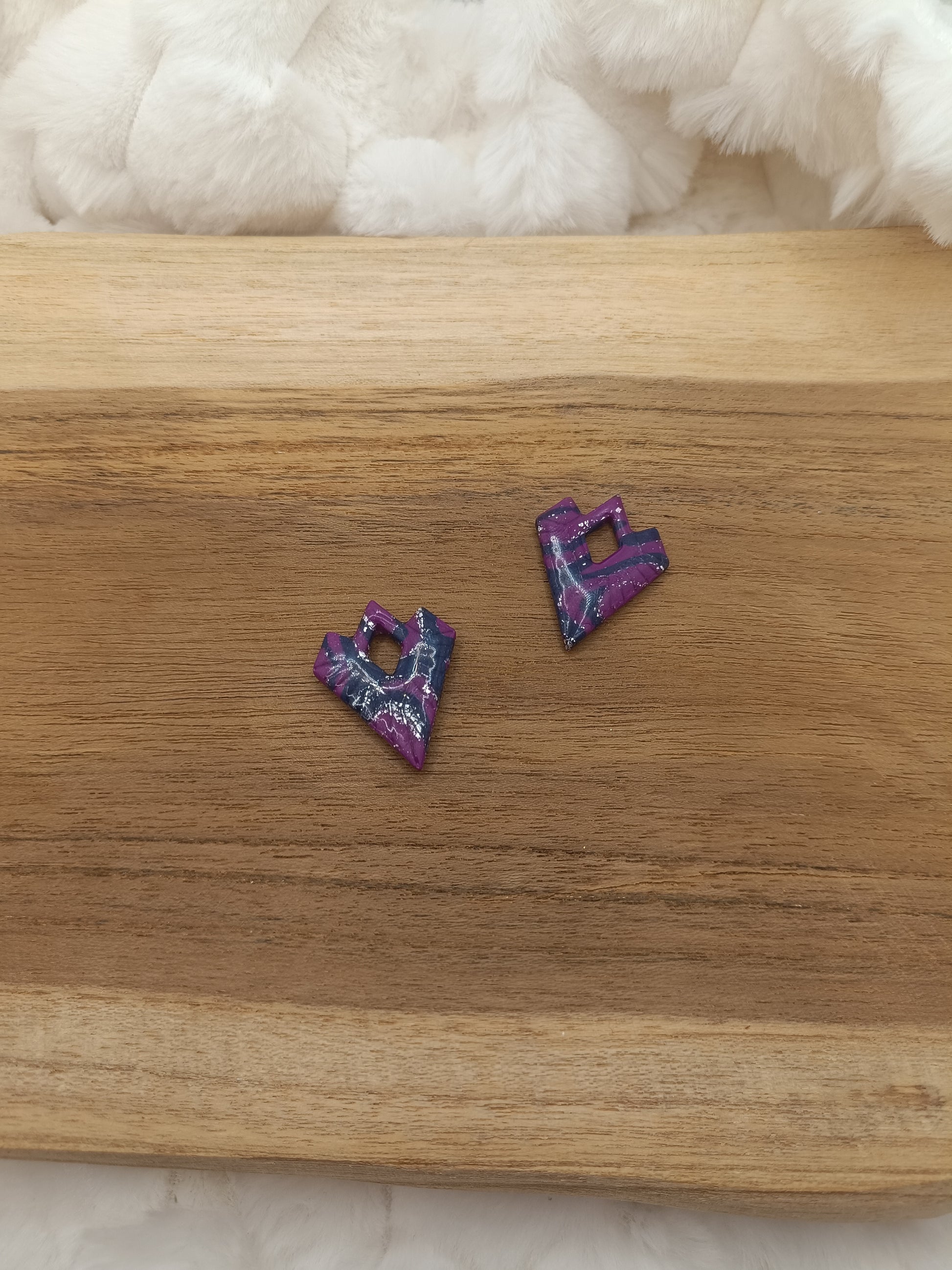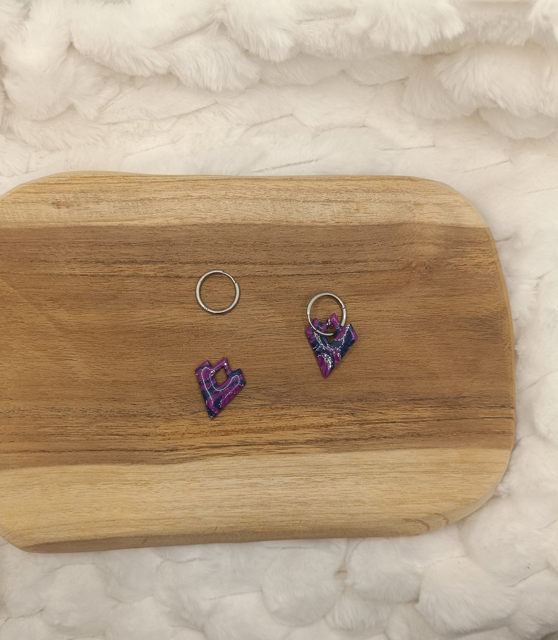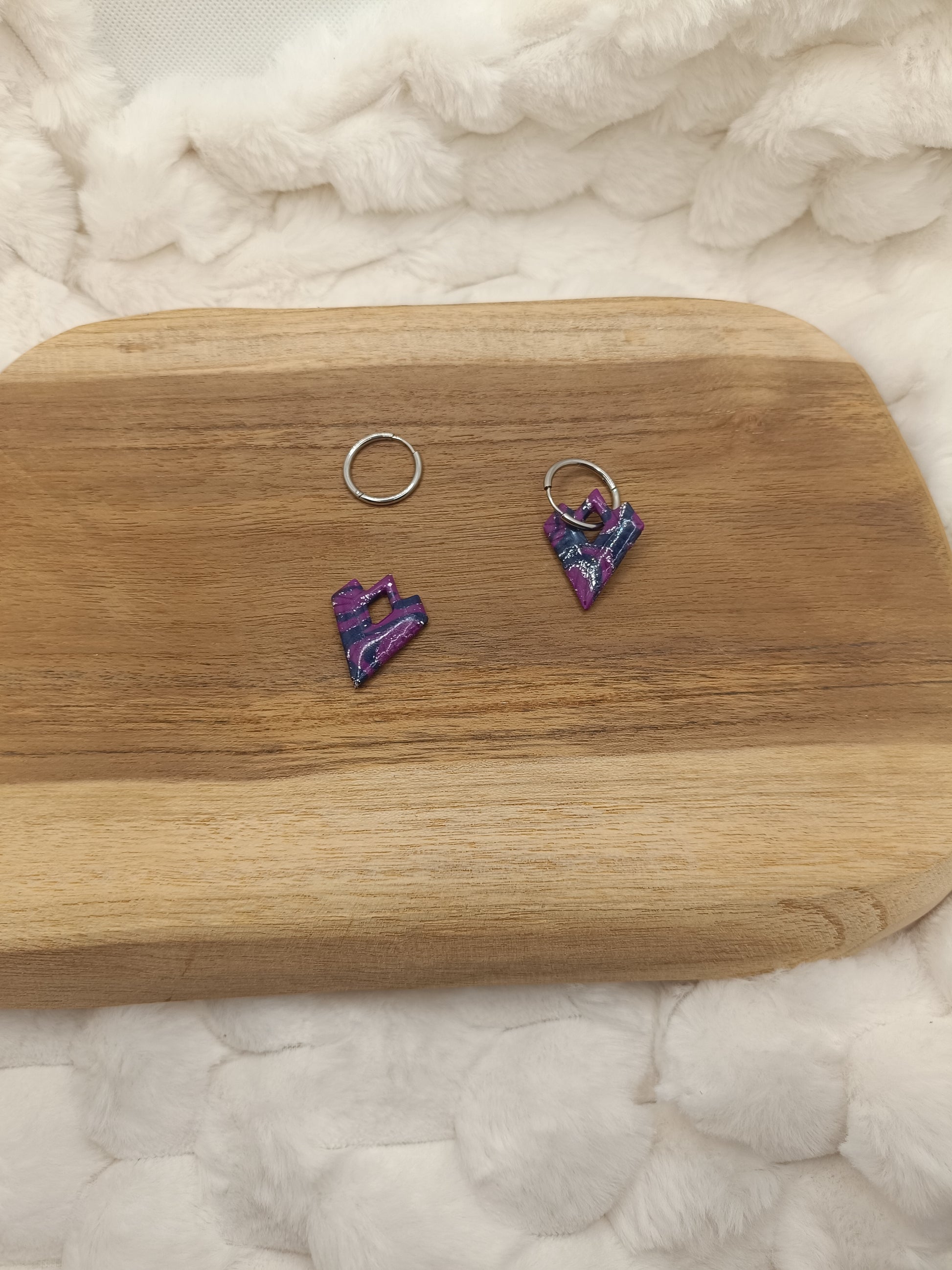 Le mélange violet, bleu et argenté, travaillé en effet marbré, donne un rendu unique et lumineux, subtilement rehaussé par une finition légèrement brillante. Montées sur des anneaux argentés, ces boucles d’oreilles sont légères, confortables et parfaites pour un usage quotidien comme pour une occasion spéciale.