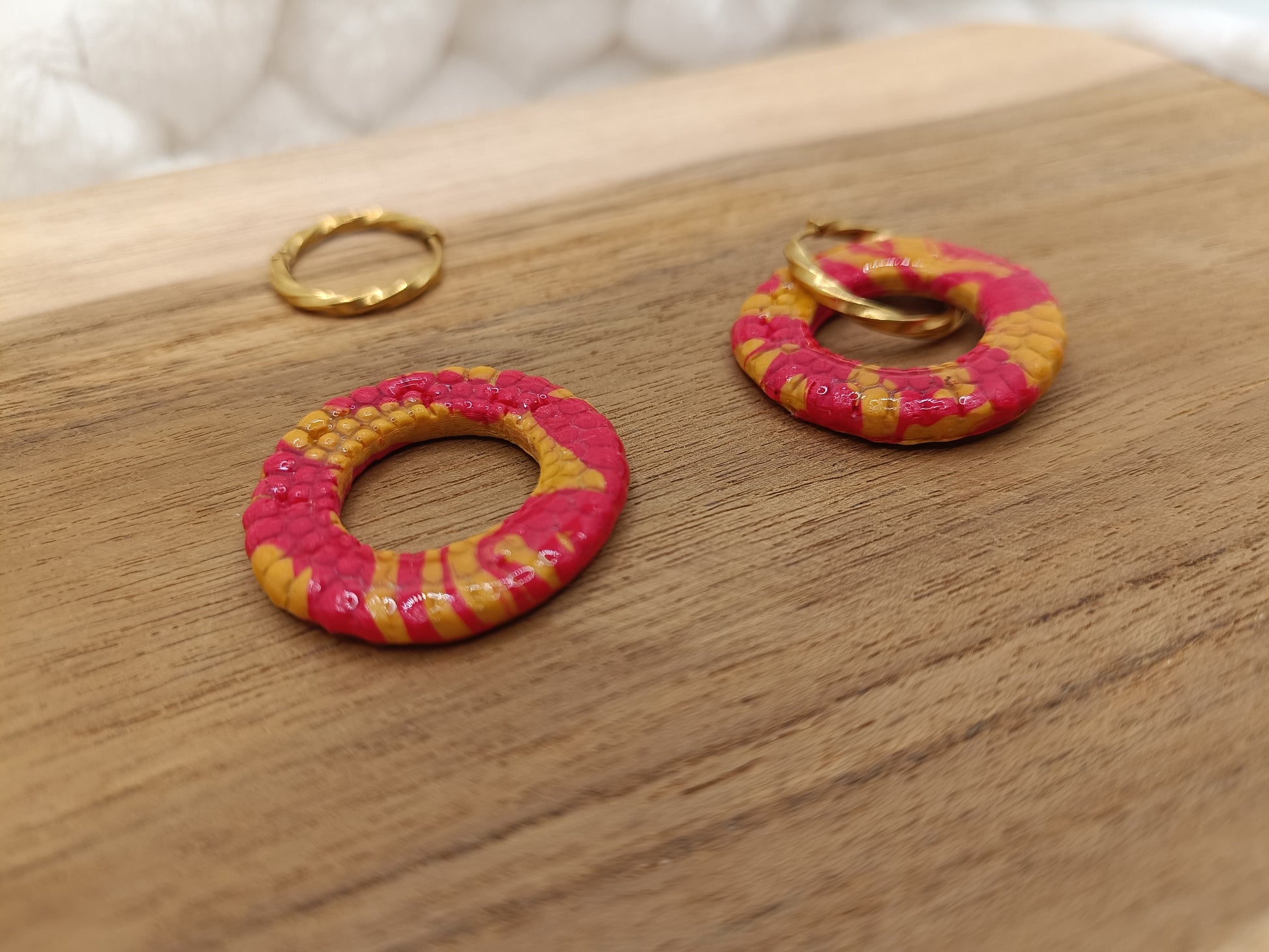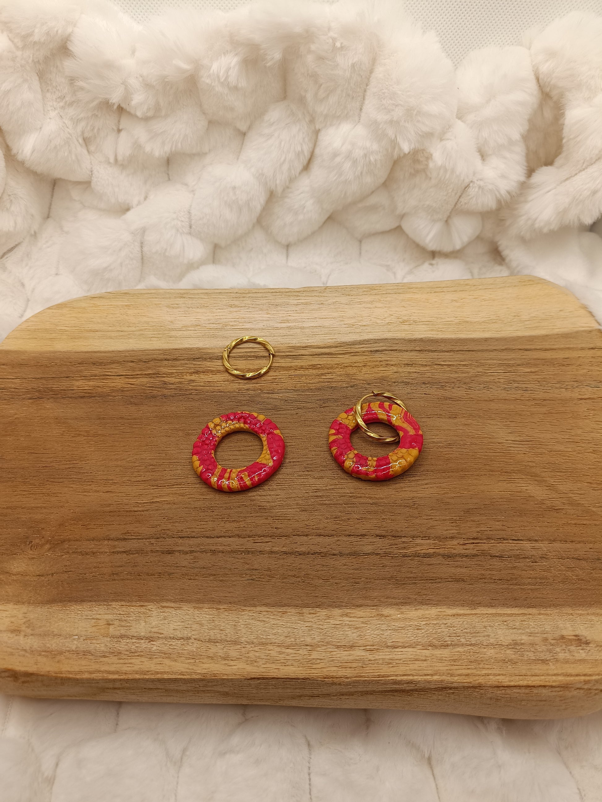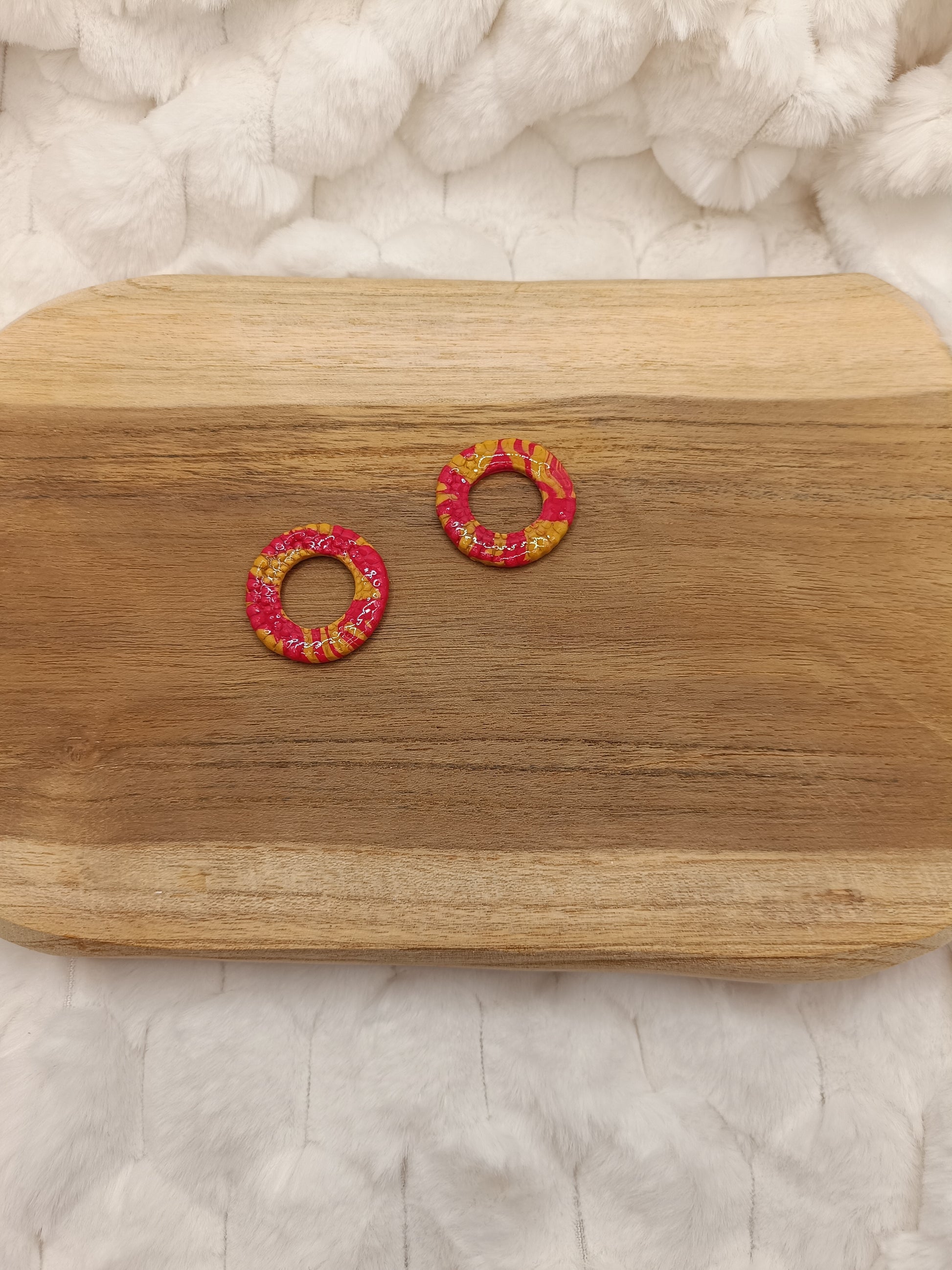 Ajoute une touche lumineuse et élégante à ton look avec ces boucles d’oreilles en pâte polymère rouges, entièrement faites main. Leur forme ronde et minimaliste est sublimée par un effet rouge intense parsemé de jolies touches jaunes, qui apportent éclat et raffinement à chaque mouvement.