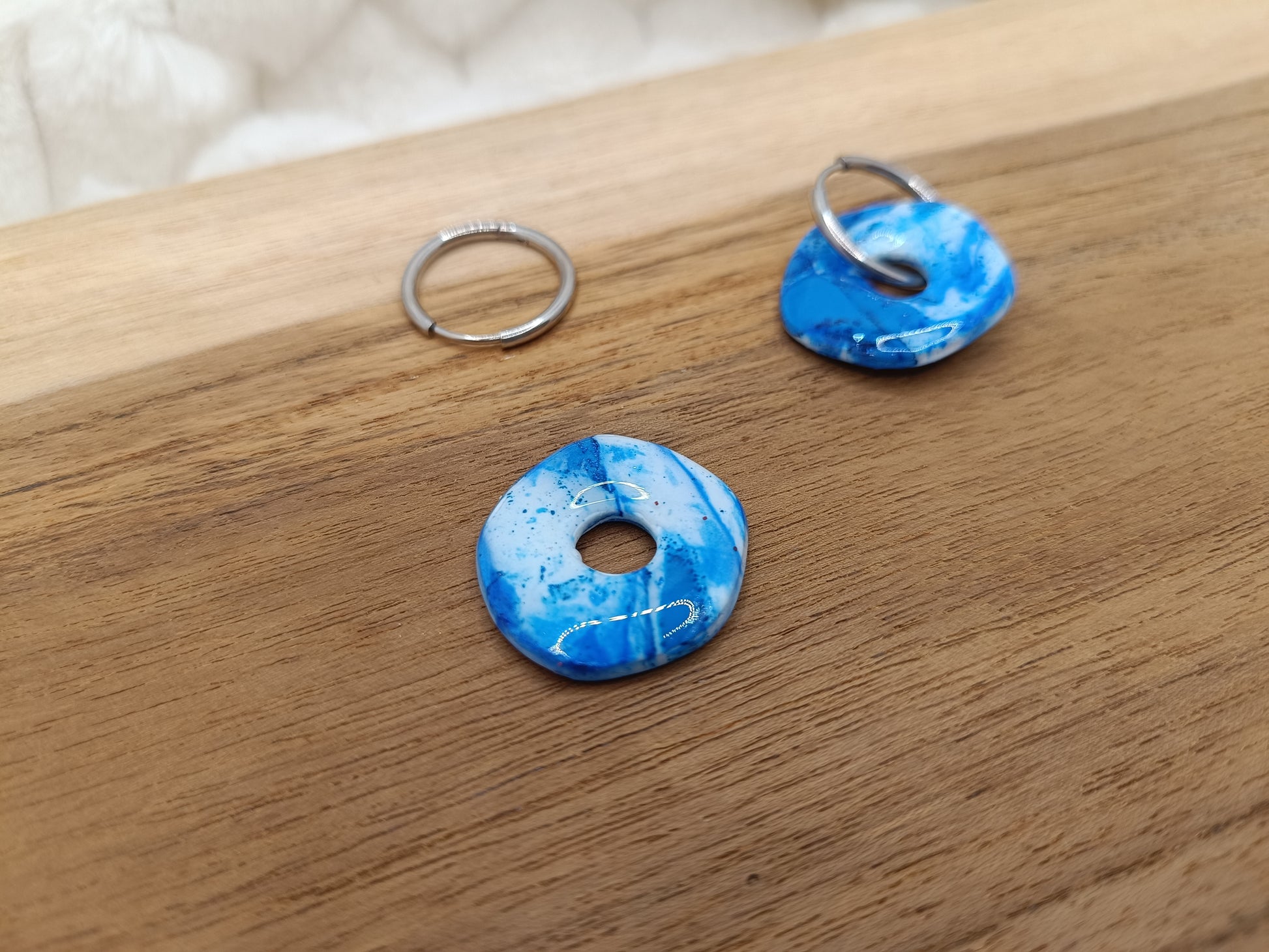 Apporte une touche de fraîcheur et de lumière à ton style avec ces boucles d’oreilles en pâte polymère bleues, entièrement faites main. Leur forme ronde et légèrement irrégulière donne un rendu moderne et doux, tandis que le motif bleu et blanc marbré évoque les reflets de l’océan et les vagues, pour un bijou original et unique.