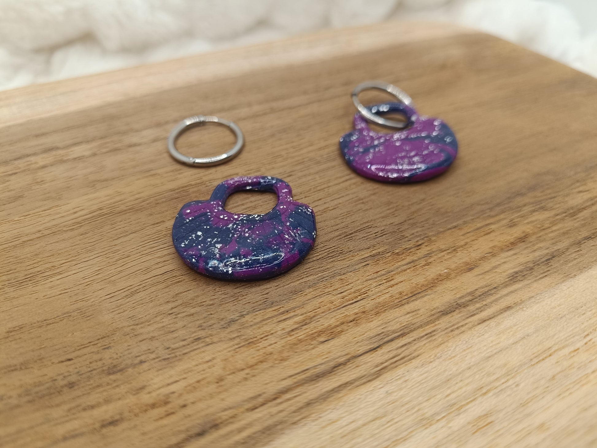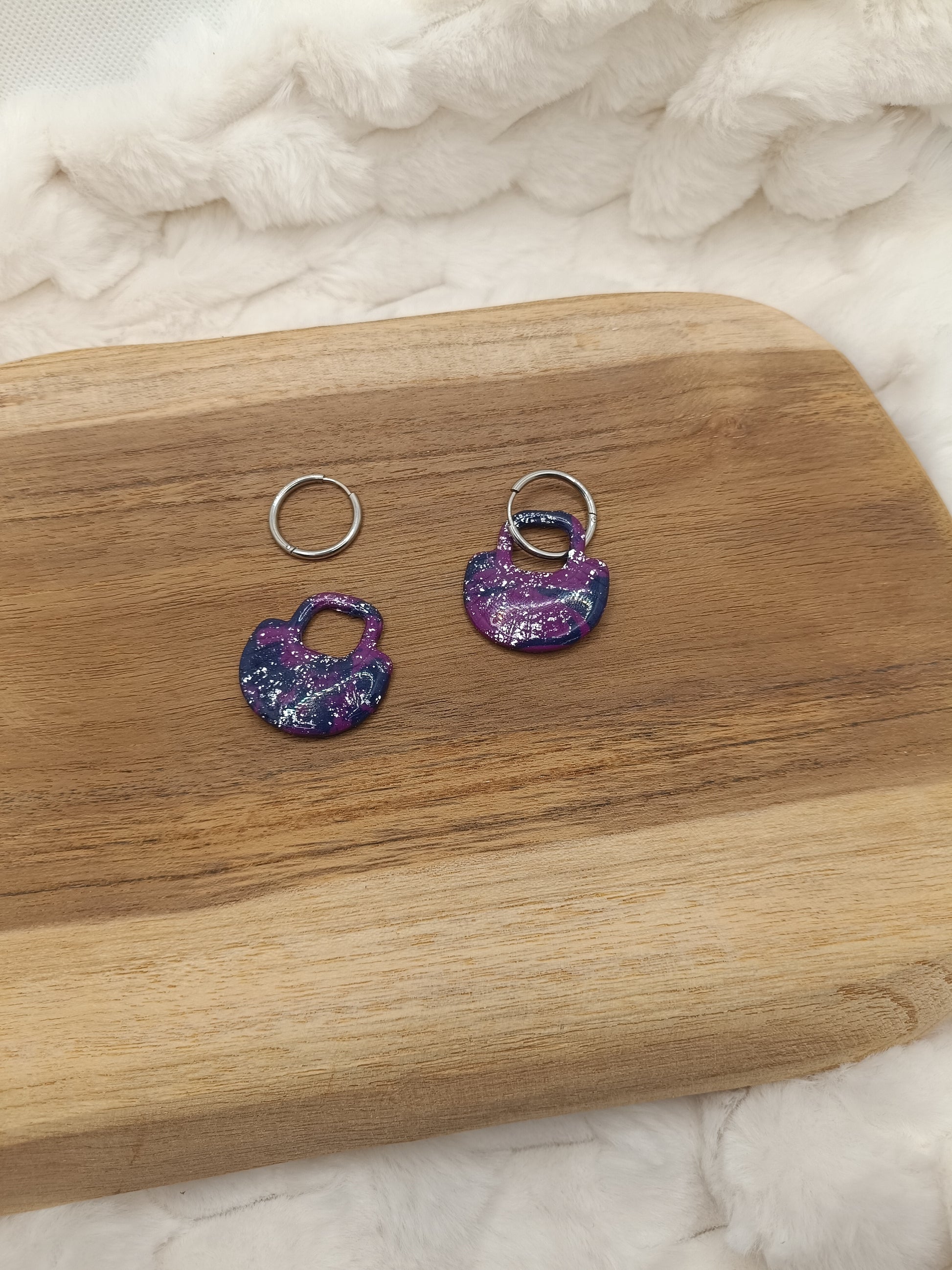 Ajoutez une touche chaleureuse et élégante à ton look avec ces boucles d’oreilles en pâte polymère bleue, violette et argentée, entièrement faites main. Leur design texturé et arrondi, associé à un superbe motif marbré , donne un rendu unique, moderne et très tendance.