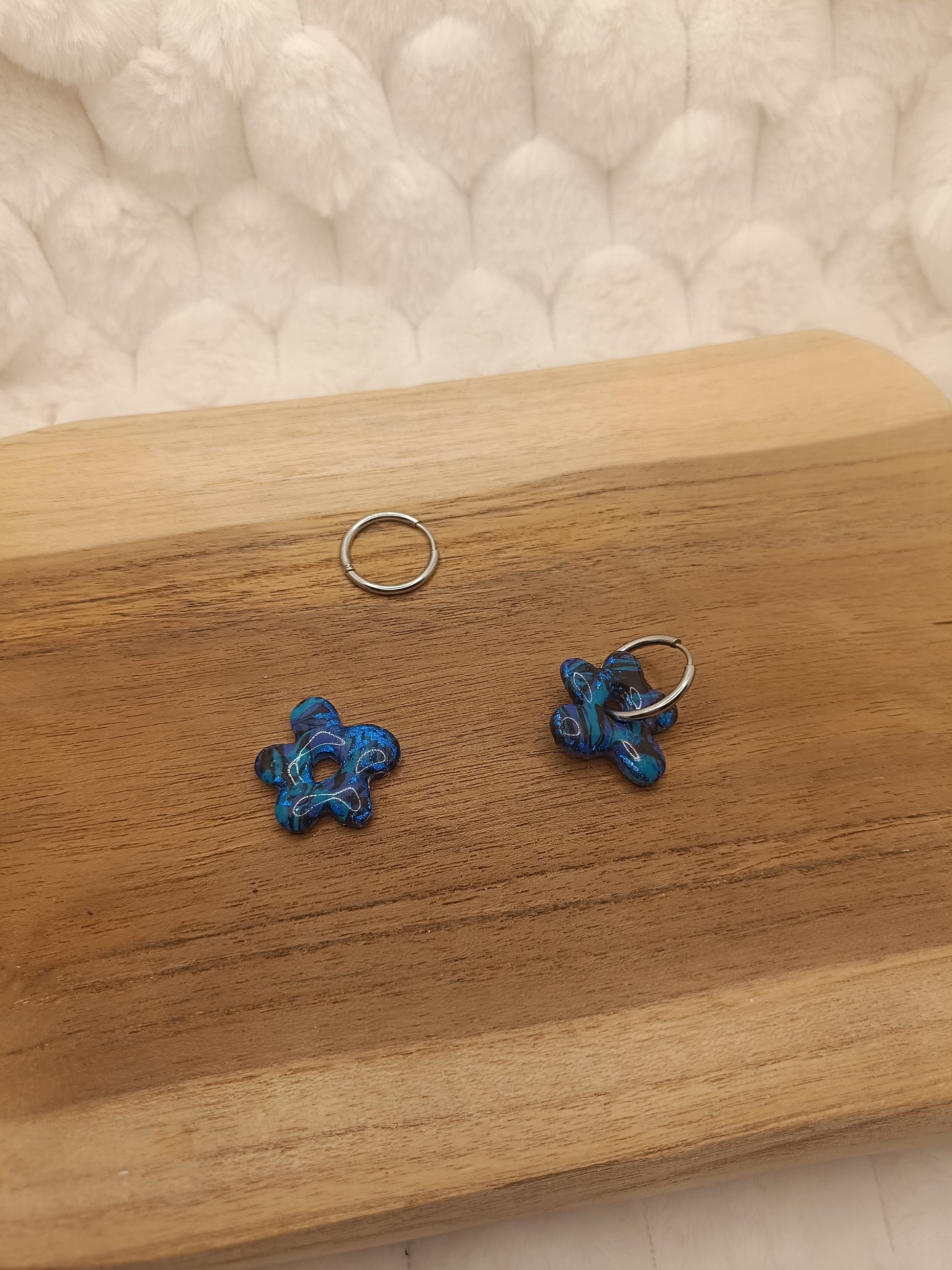 Sublime ton look avec ces boucles d’oreilles fleur en pâte polymère, une création artisanale pleine de caractère et de reflets. Leur forme fleur légèrement étoilée, associée à un superbe mélange de bleu profond et de nuances marbrées, rappelle les reflets de l’océan et apporte une touche élégante et originale à toutes tes tenues.