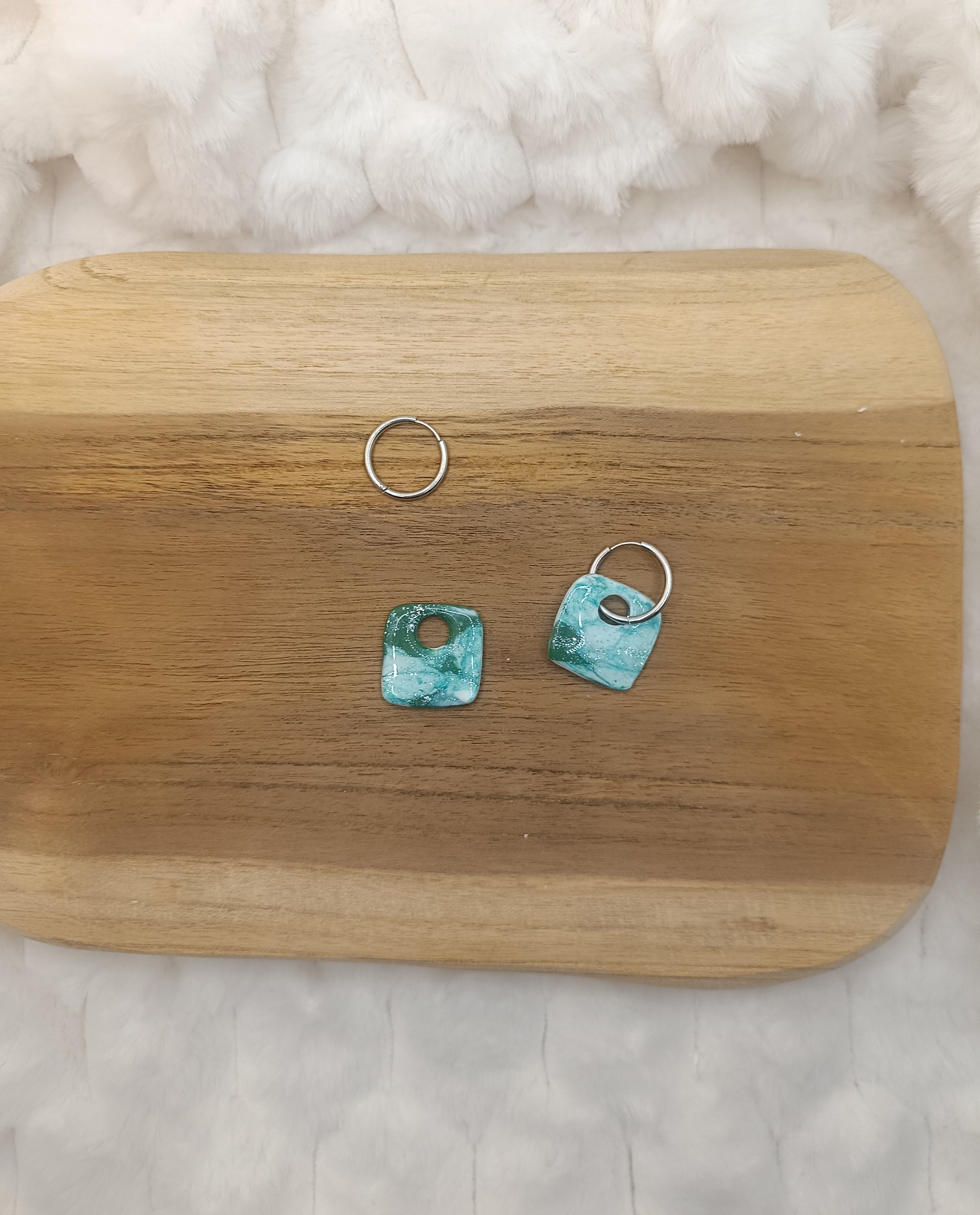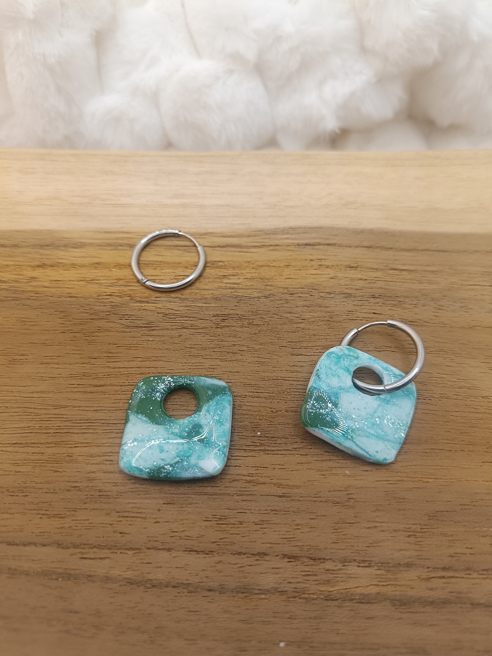 Craquez pour ces boucles d’oreilles carrées en pâte polymère, une création artisanale originale au style graphique et moderne. Leur forme carrée aux angles arrondis apporte une touche minimaliste, tandis que le mélange blanc et vert crée un contraste lumineux et tendance, parfait pour rehausser une tenue en un clin d’œil.