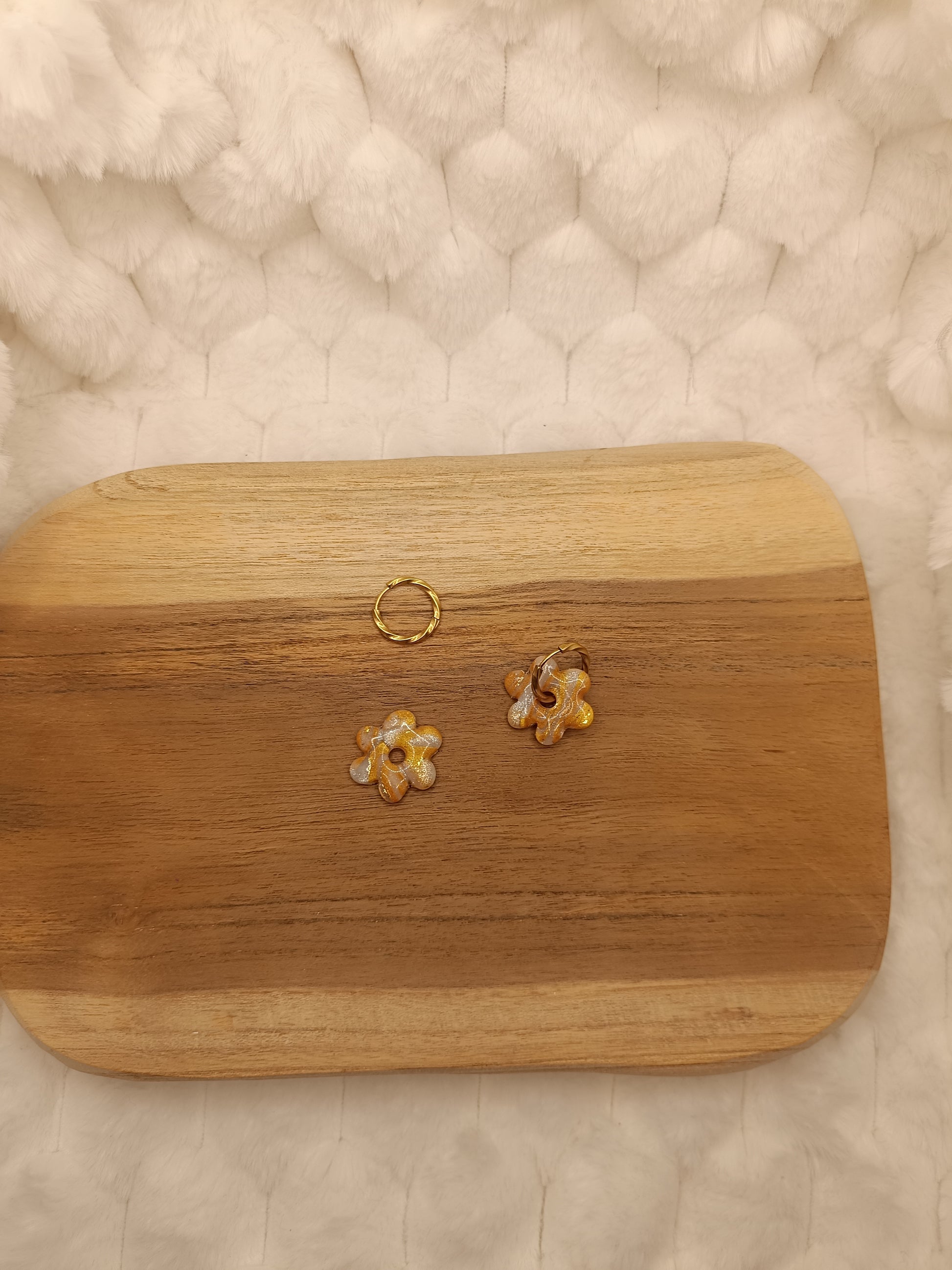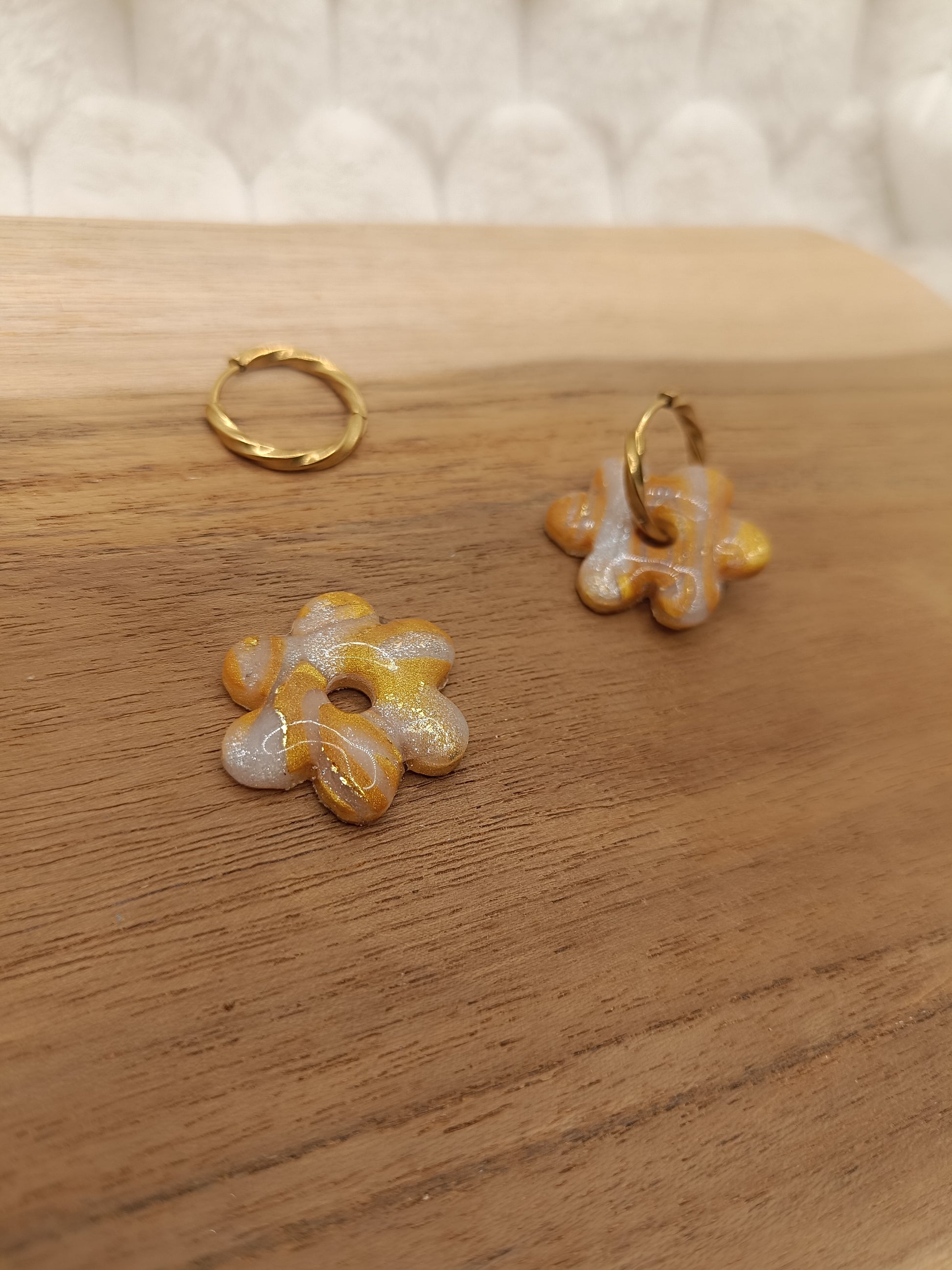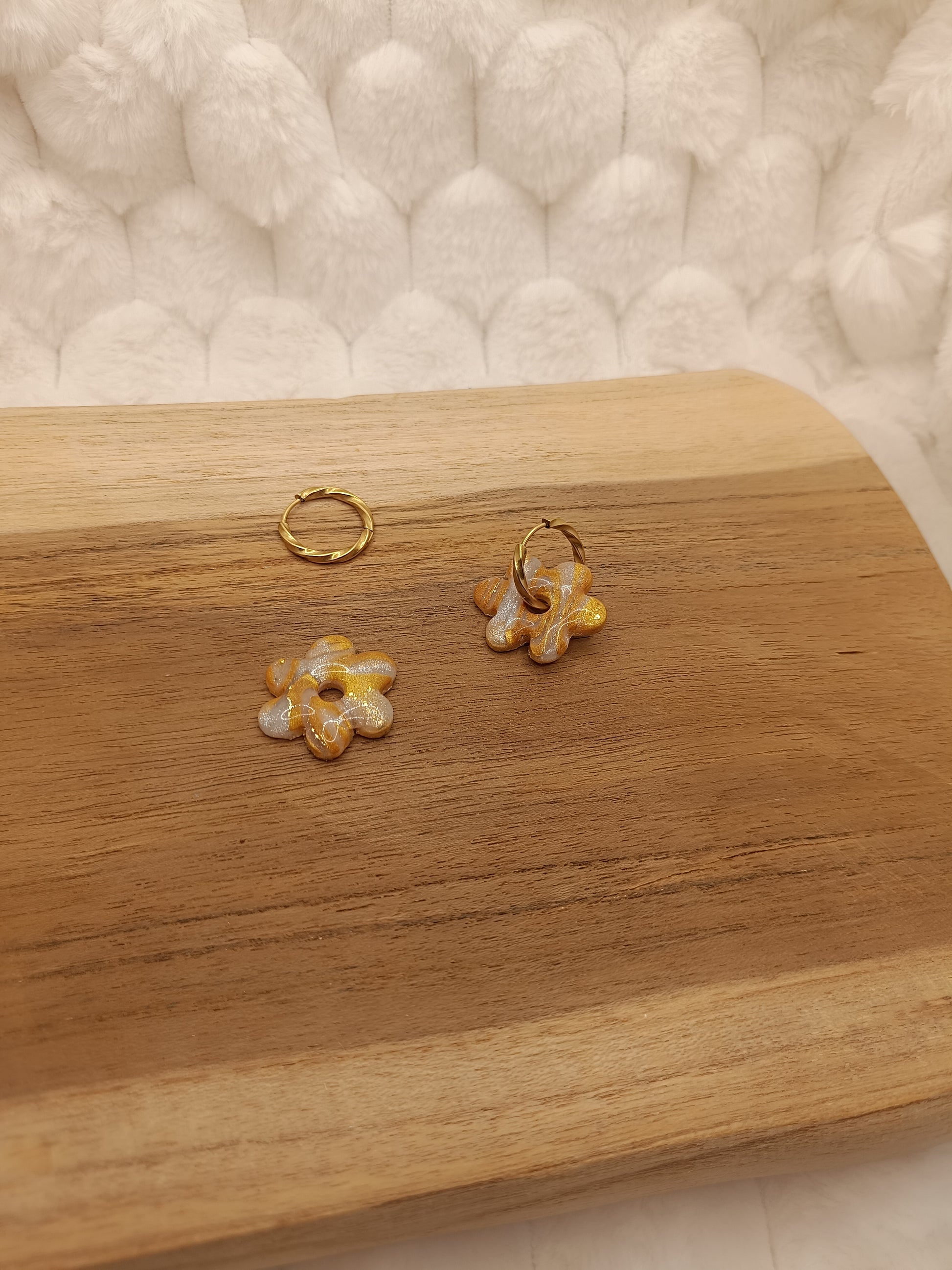 Ajoute une touche de couleur et de douceur à ton style avec ces boucles d'oreilles marbré doré et translucide en pâte polymère, entirérement faite à la main avec soin. Leur design fleuri et minimaliste apporte une note fraiche et lumineuse, parfaite pour un look du quotidien comme pour une tenue plus habillée.