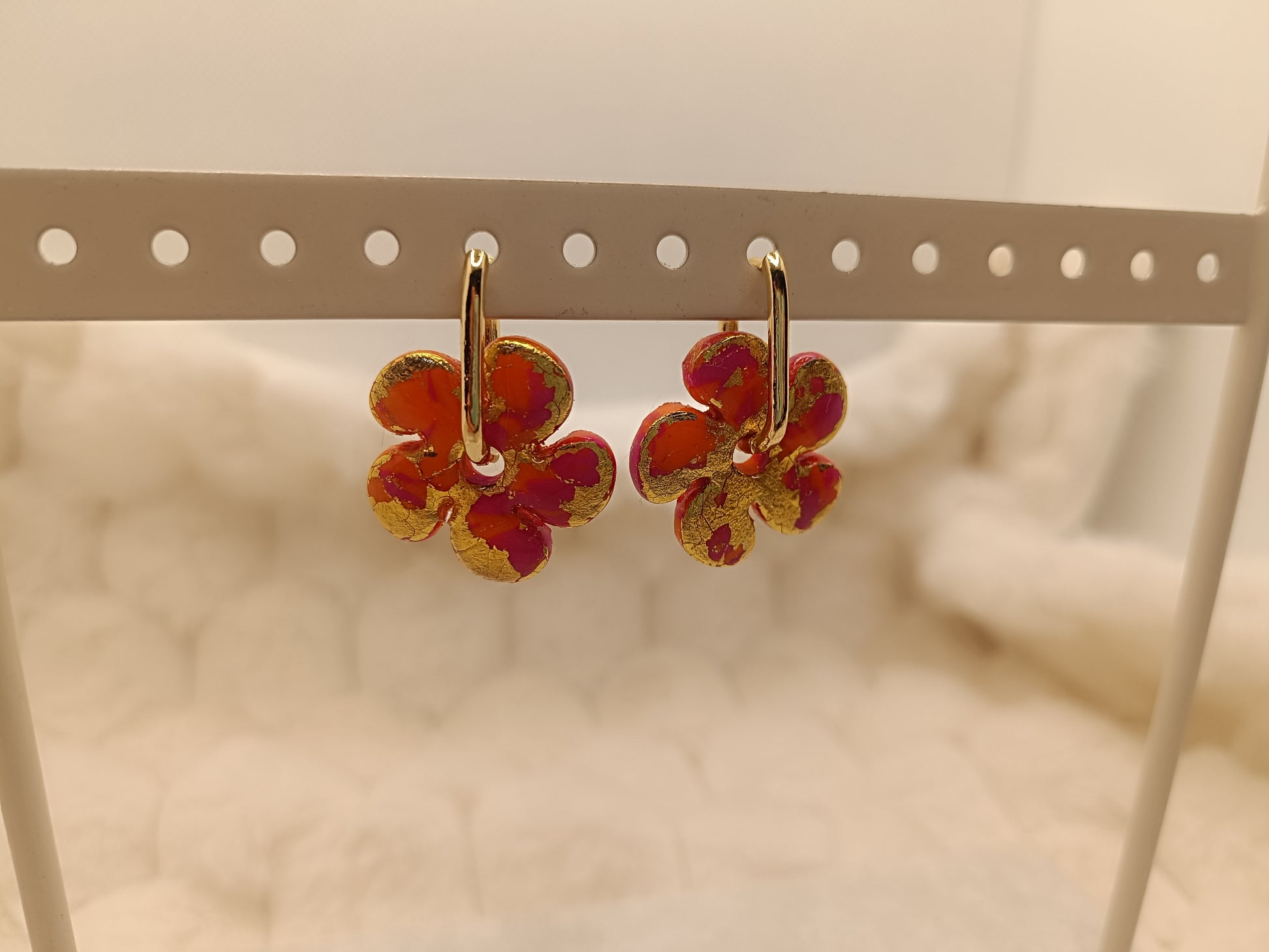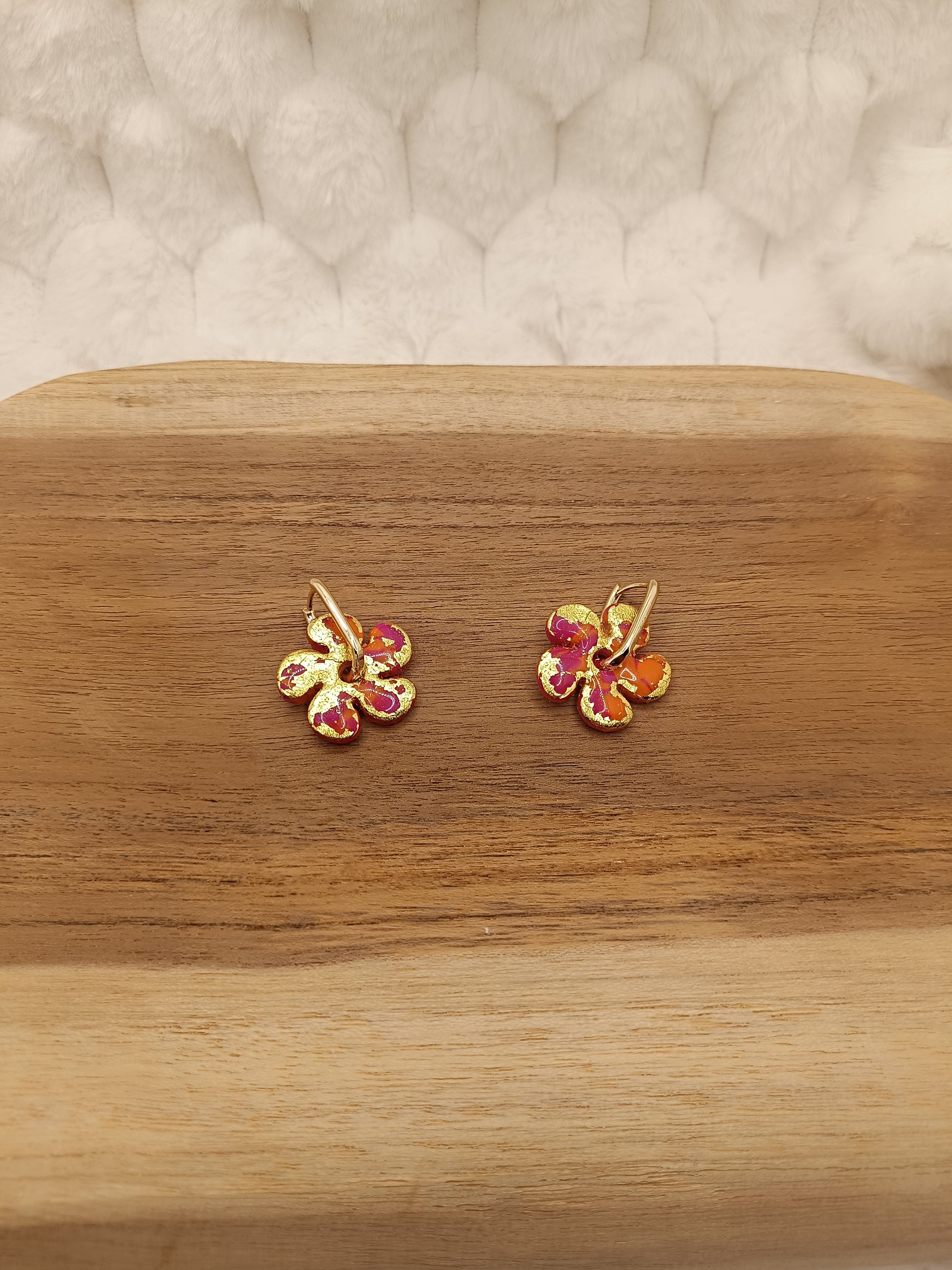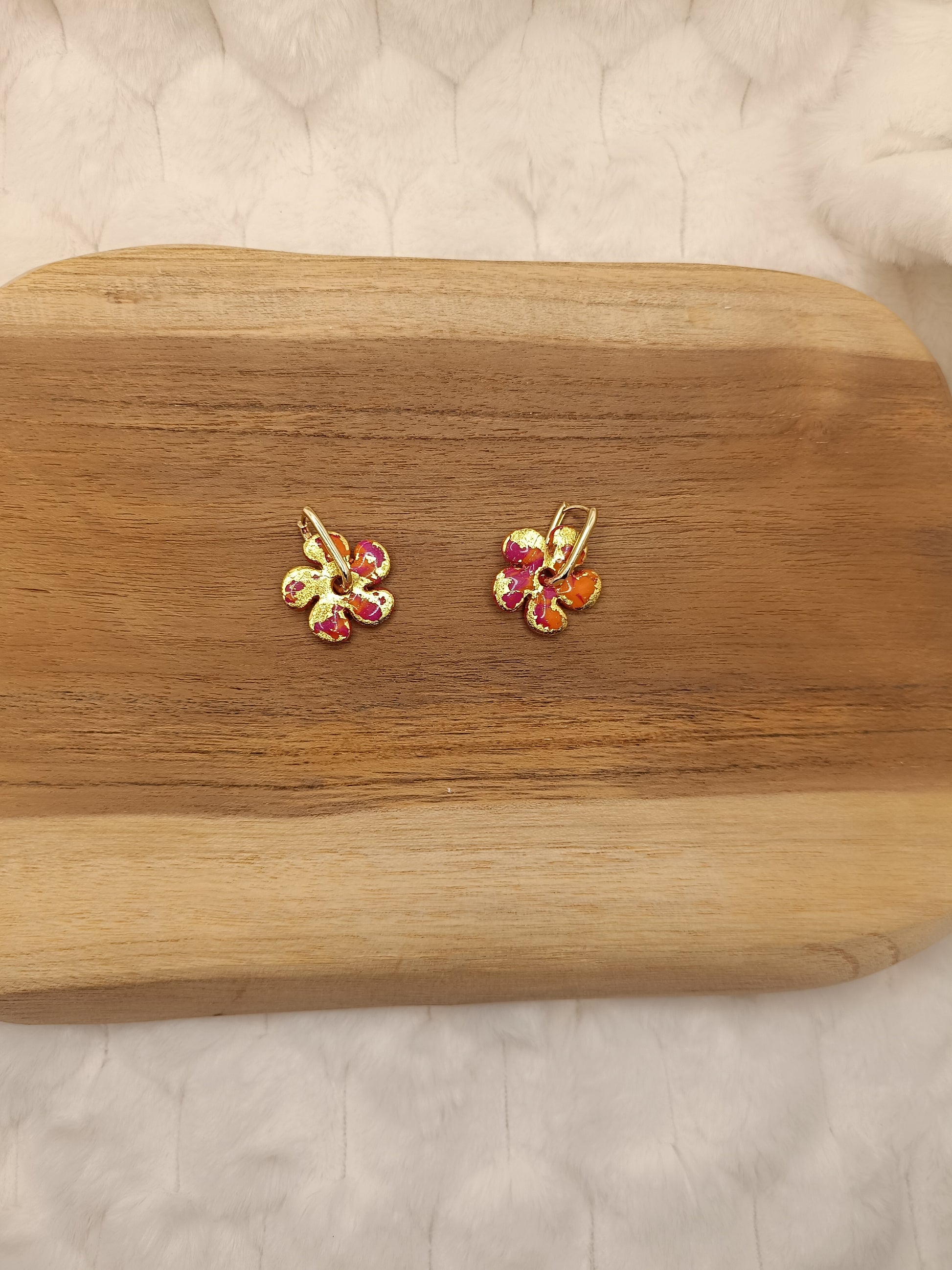 Ajoute une touche de couleur et de douceur à ton style avec ces boucles d'oreilles marbré rose, orange et doré en pâte polymère, entirérement faite à la main avec soin. Leur design fleuri et minimaliste apporte une note fraiche et lumineuse, parfaite pour un look du quotidien comme pour une tenue plus habillée.