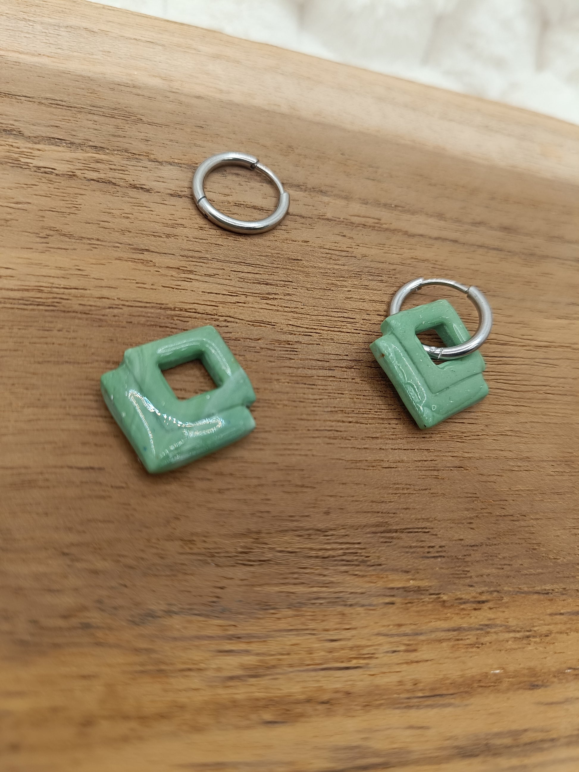 Un duo graphique et lumineux avec un joli vert pistache en pâte polymère, accompagné de trés belles créoles argentées.