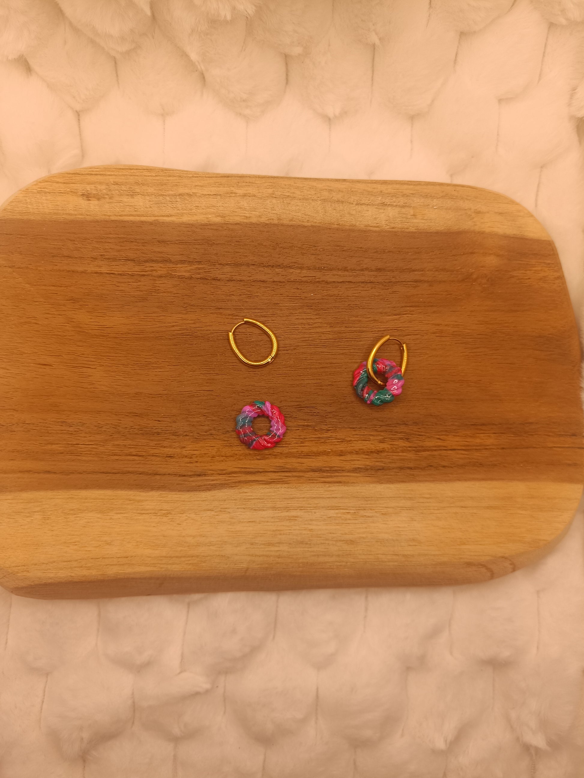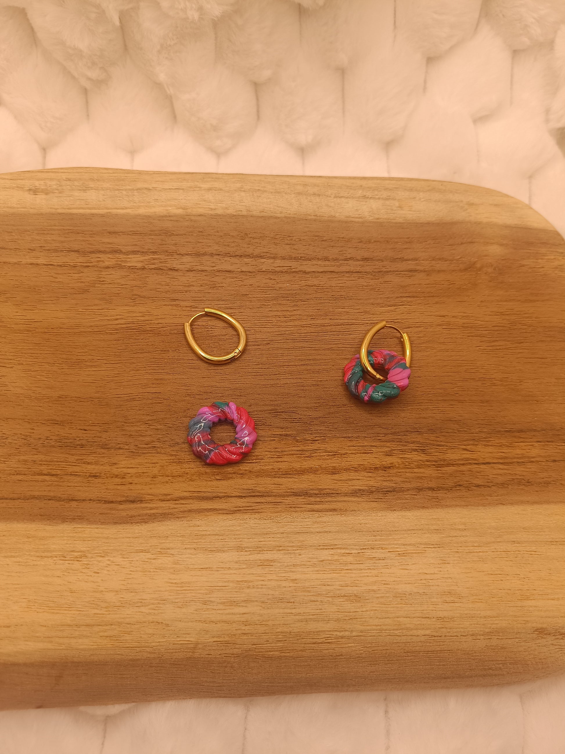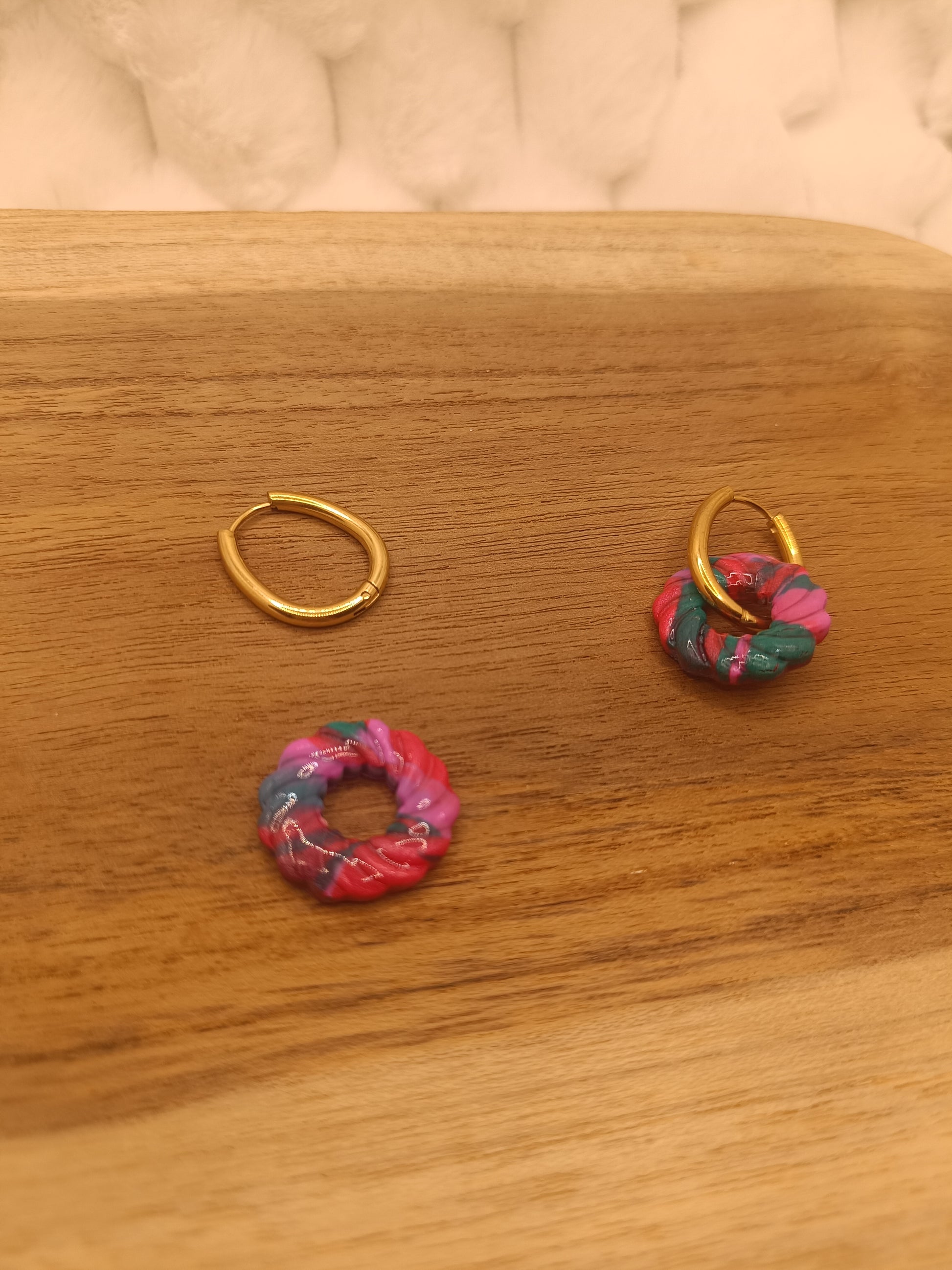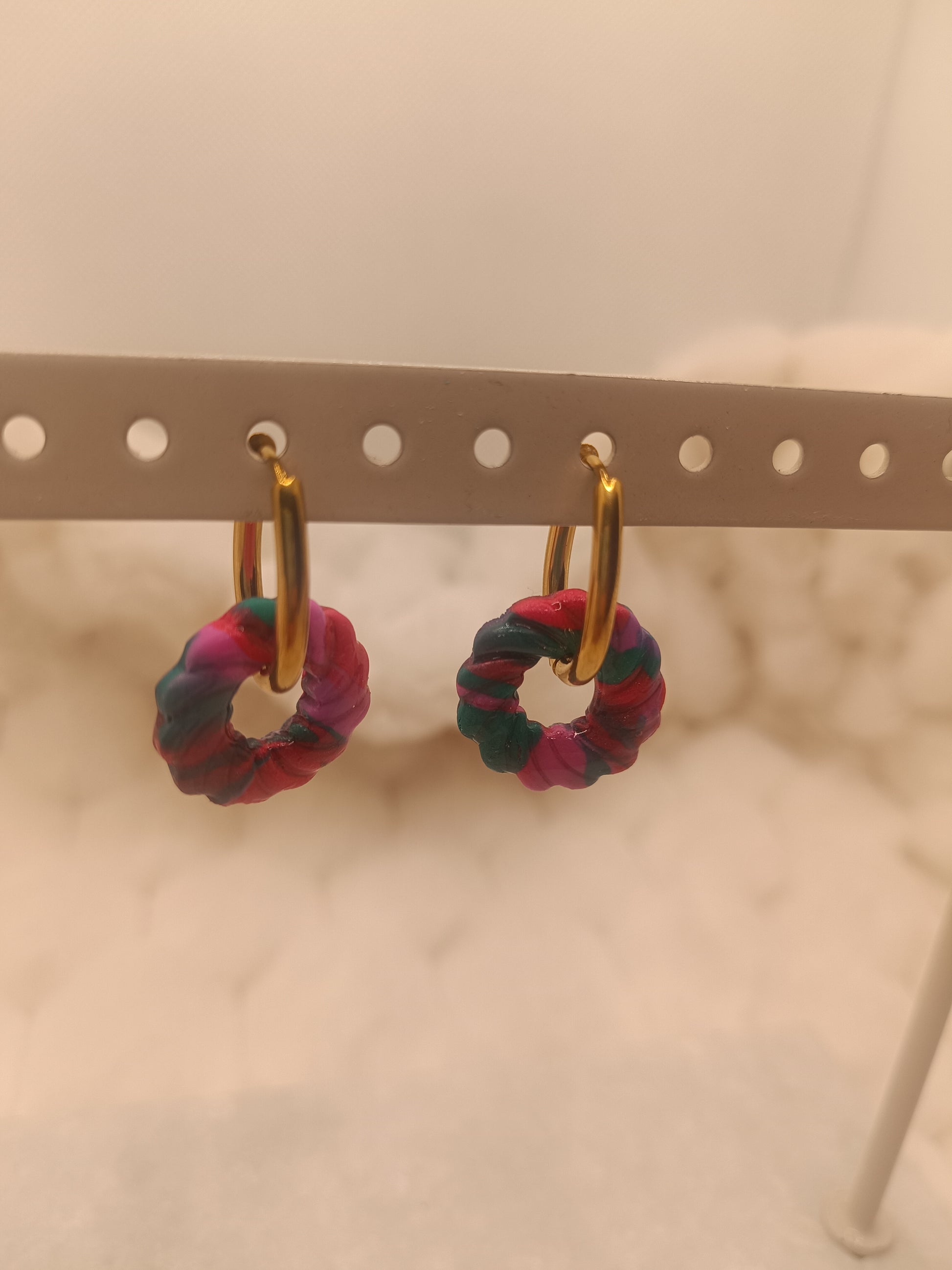 Apporte une touche chaleureuse et lumineuse à ton style avec ces boucles d’oreilles en pâte polymère verte,rouge et rose, entièrement faites main. Leur forme ronde minimaliste est sublimée par une finition légèrement texturée et de jolies paillettes dorées, qui captent la lumière et ajoutent une note élégante.