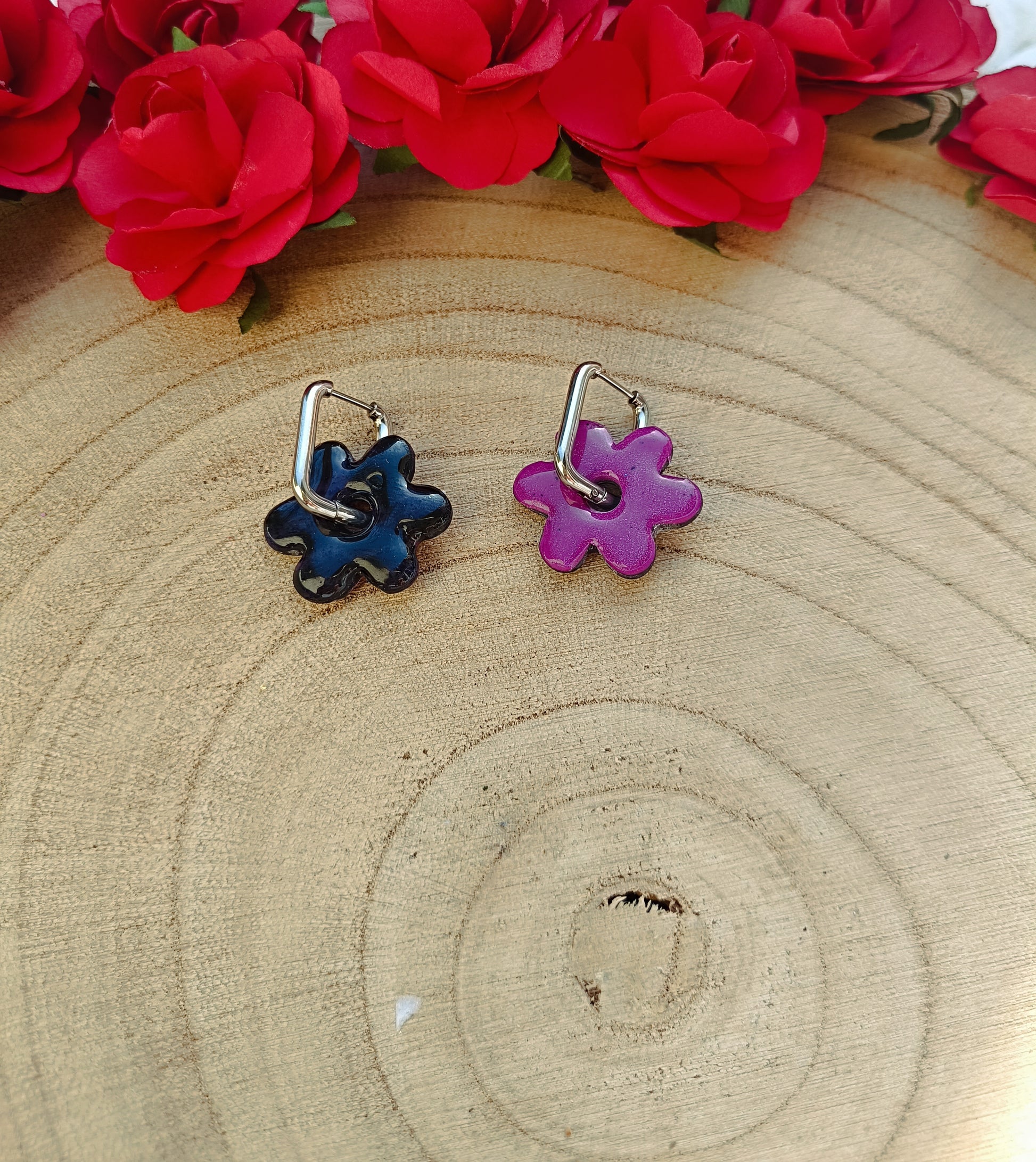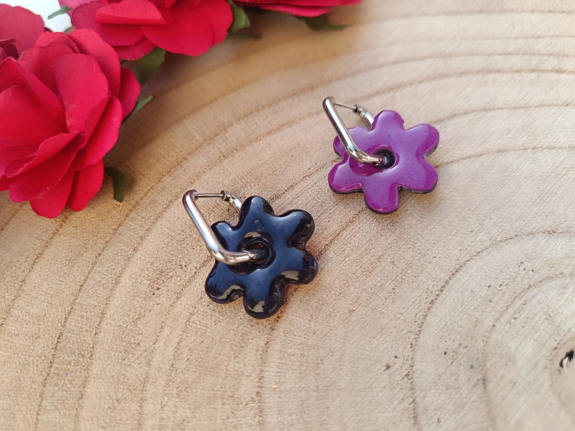Sublimez votre look avec ces boucles d’oreilles fleur en pâte polymère, une création artisanale pleine de caractère et de reflets. Leur forme fleur légèrement étoilée, associée à un superbe mélange de violet et noir sur une face et de prune sur l'autre face, leur apporte une touche élégante et la possibilité d'être réversible pour s'adapter à encore plus de vos tenues