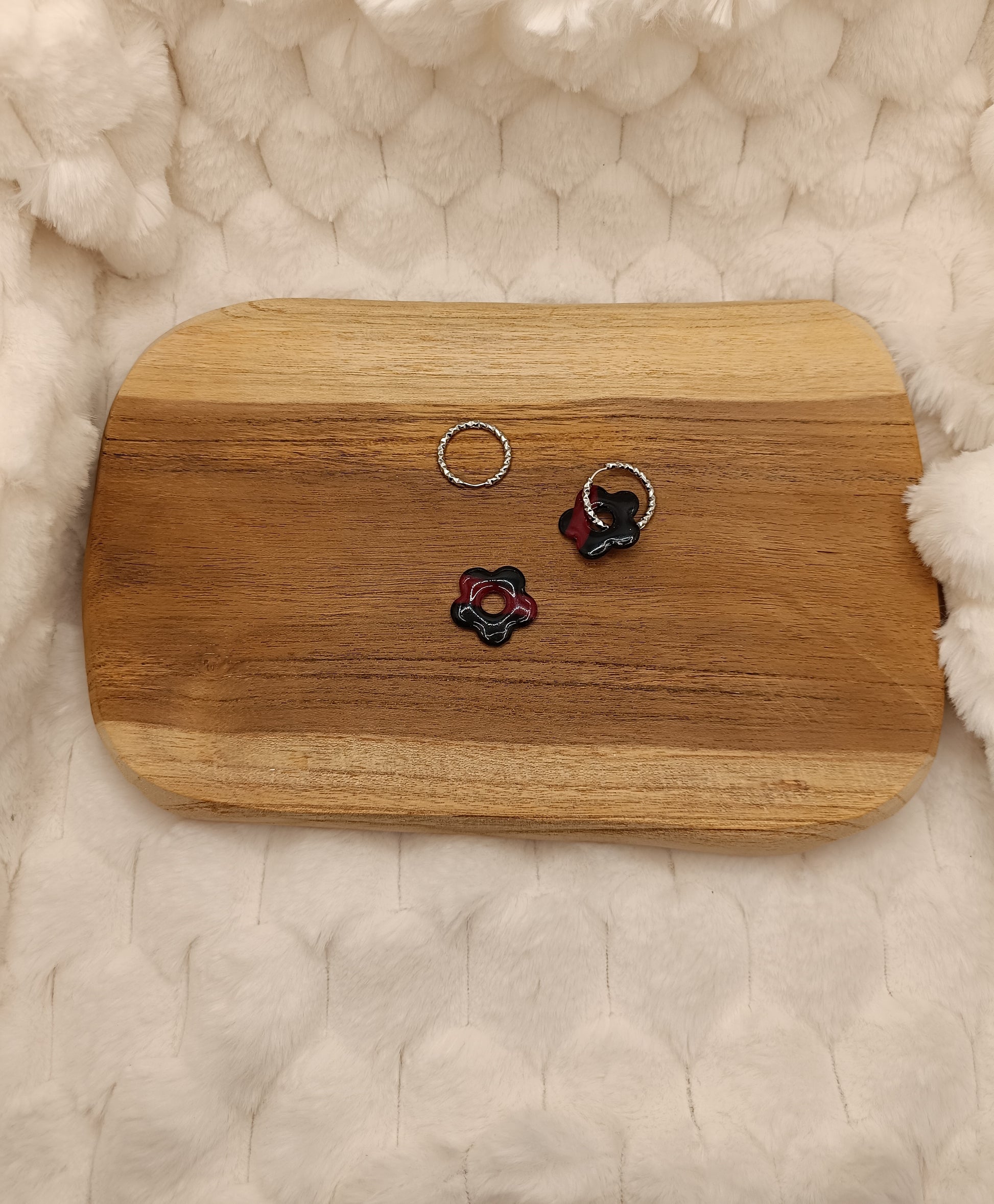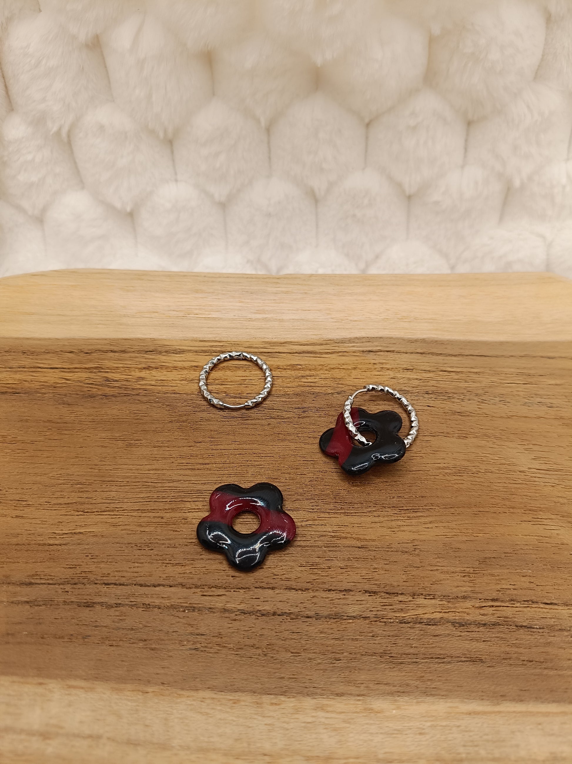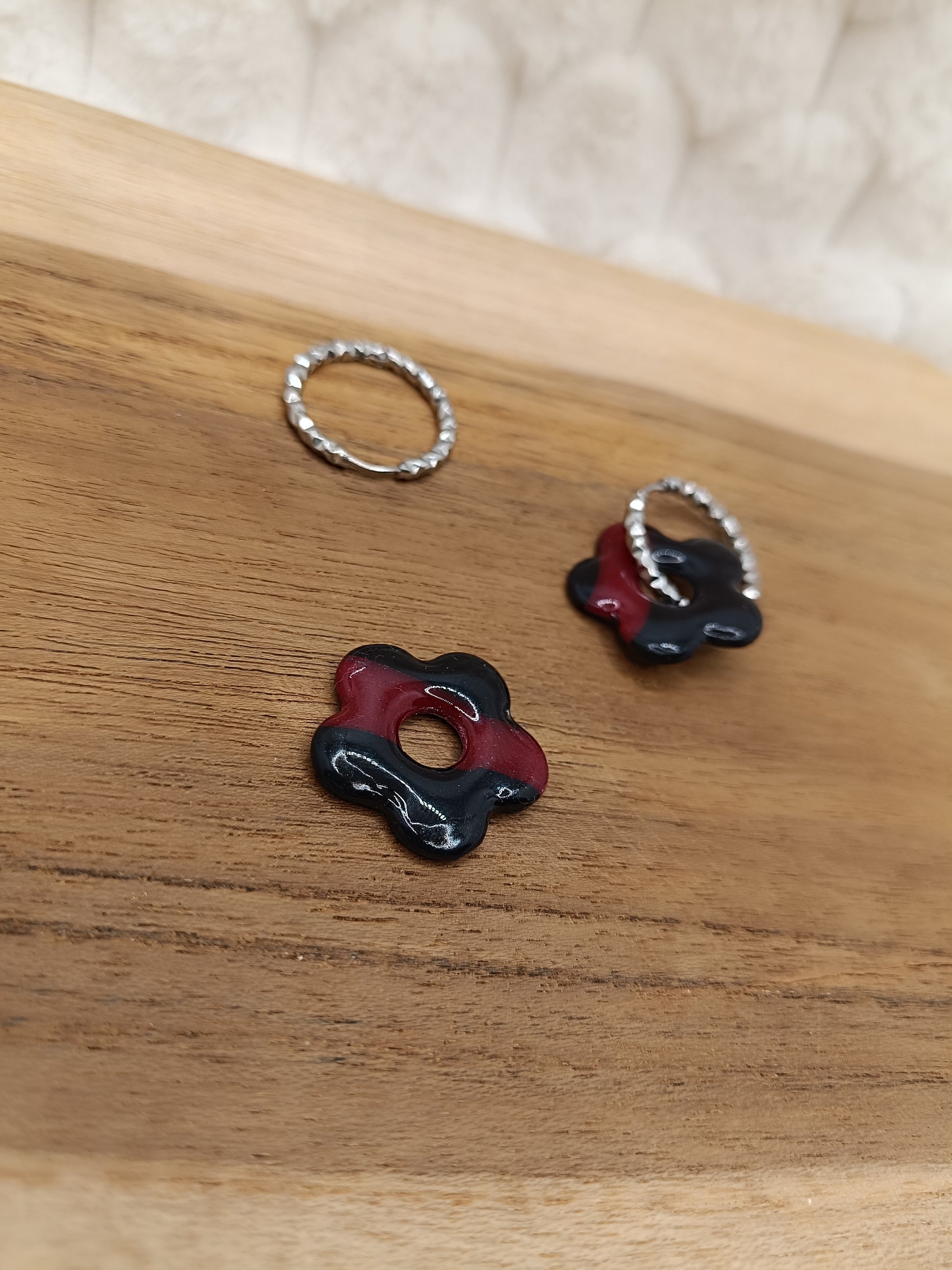 Ajoute une touche de couleur et de douceur à ton style avec ces boucles d'oreilles marbré noir et fuschia translucide en pâte polymère, entirérement faite à la main avec soin. Leur design fleuri et minimaliste apporte une note fraiche et lumineuse, parfaite pour un look du quotidien comme pour une tenue plus habillée.