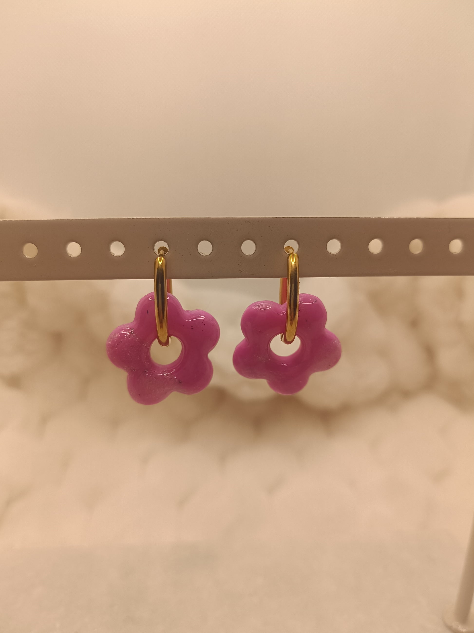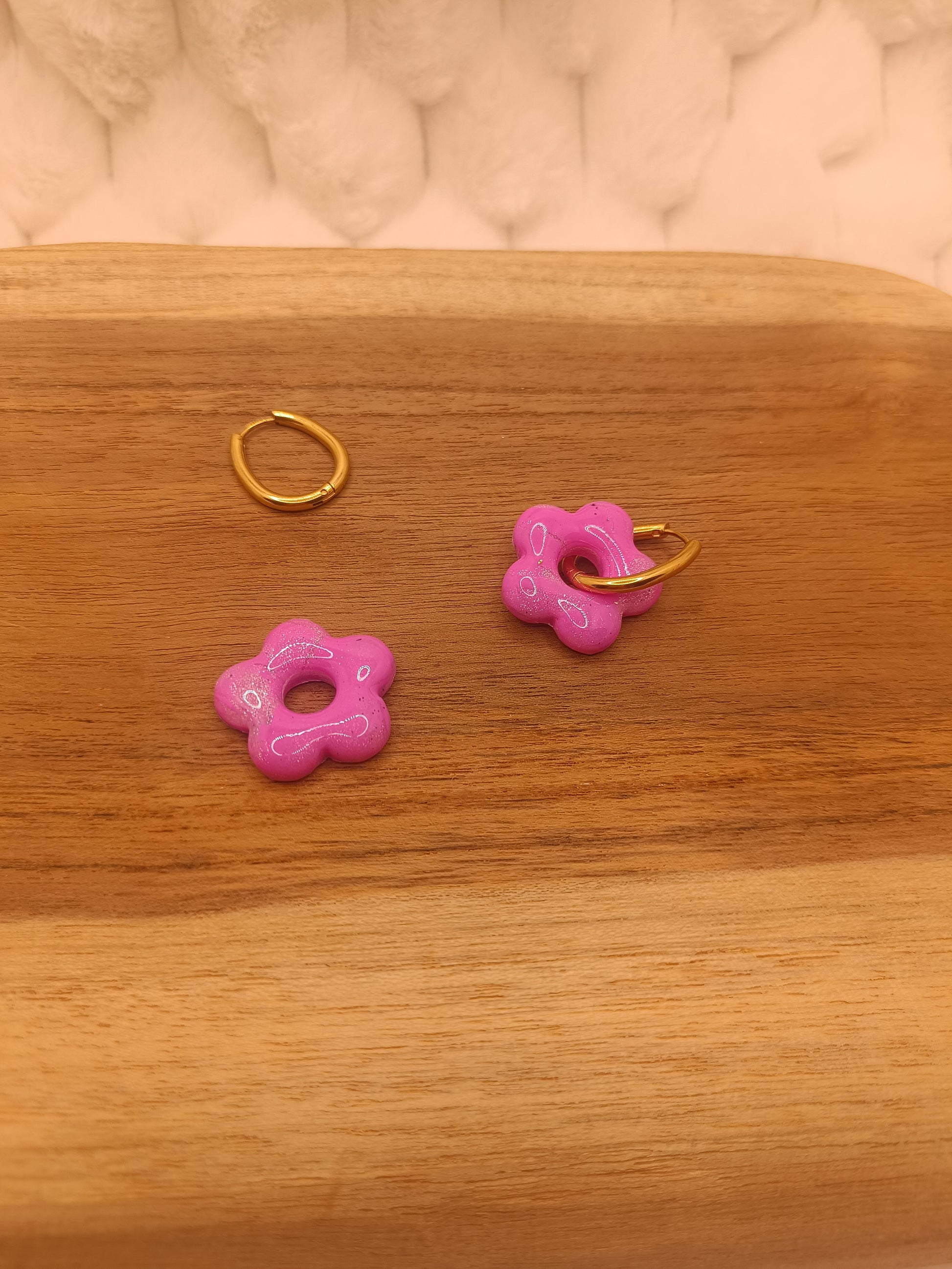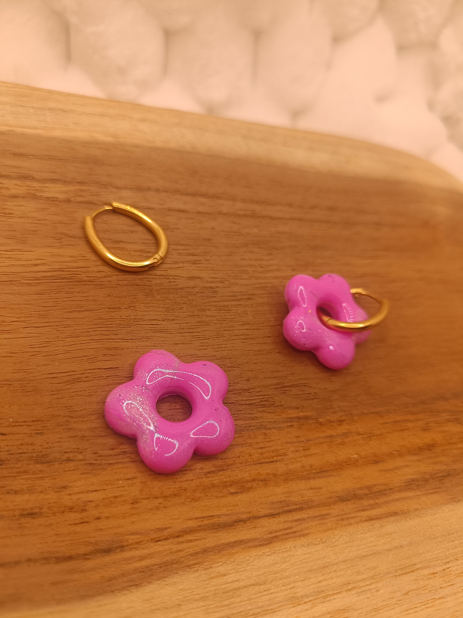 Ajoute une touche de couleur et de douceur à ton style avec ces boucles d'oreilles rose et translucideen pâte polymère, entirérement faite à la main avec soin. Leur design fleuri et minimaliste apporte une note fraiche et lumineuse, parfaite pour un look du quotidien comme pour une tenue plus habillée.